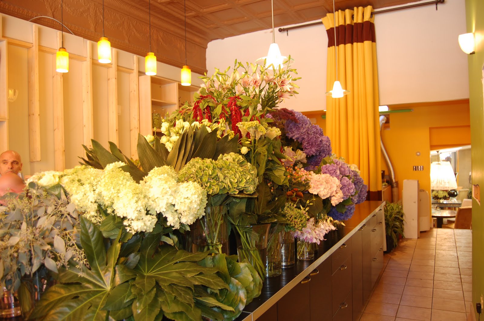 Then we moved on to arranging. I learned some rules about creating a floral arrangement including the first commandment: thou shall not arrange symmetrically. I also learned that sometimes customers and florists don’t speak the same language. Words like “colorful,” “texture,” and themes like “Tuscan” can mean very different things to different people. We created one arrangement for a customer to bring to a man’s birthday party, which turned out beautifully despite the unusual color palate request of orange and purple. We also created a bouquet using a flower that honestly looks like human brain matter, but among hydrangeas, tulips and thistle it looks lovely.