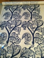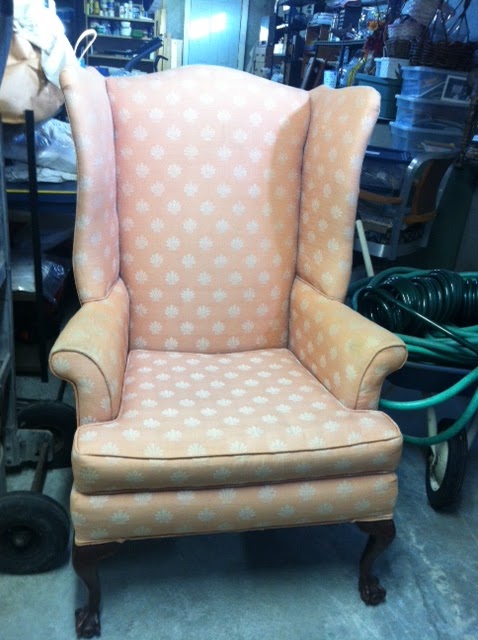 After bringing one of my grandmother’s piano benches, and an ottoman back to life, I have begun my next class at the Eliot School of Art with a very challenging project: a wing chair. I found the wing chair on ebay for $99 for a set of two (amazing deal), and I found some gorgeous Hinson & Company fabric at Griswold’s fabric outlet (a treasure trove of designer fabric at deep discount) and hauled it all to Jamaica Plain this past week.