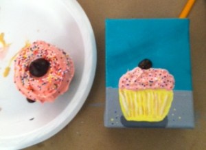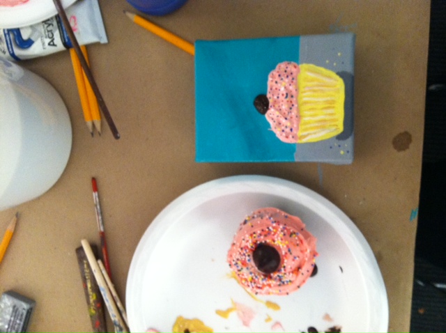 I sat down with a small canvas and my model, a Pepto-Bismol pink topped cupcake, which Rosalie was so kind to make for the occasion, and set out to prove that the artistic family genes had not gone exclusively to my little brother. I started out by drawing a cupcake on the canvas. It looked more like the mushroom cloud over Nagasaki than a cupcake, but I convinced myself that I could improve its shape with paint.