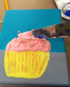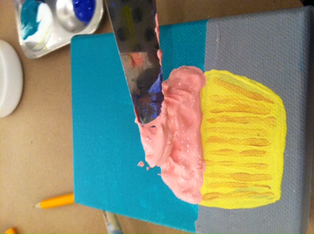 It was at that point that I rolled up my sleeves and got dirty, literally. I started with the base of the cupcake. My model cupcake was chocolate, but because I am allergic to chocolate I took some artistic liberties and made mine vanilla. I mixed a light yellow to bring the cake to life. I then heaped a generous dollop of pink oil paint on top with a pallet knife. Rosalie encouraged us to slather the paint as if it was actual frosting and the technique proved effective…and appetizing.