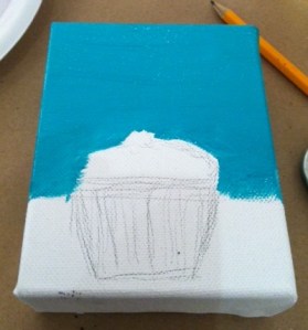 I mixed a bright (imagine that, me utilizing a bright color) shade of teal to create the background for my cupcake, then I used a light gray for the table on which it would sit. But when it came time to paint the actual cupcake I was paralyzed. I was worried about messing up. I called Rosalie over several times to discuss technique and approach. I went over and over every detail with her. I looked at the white silhouette where my cupcake should be with my paint brush poised to paint, but unable to begin.