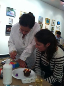 Last week I attended “So You Think You Can Paint,” an event held at the Copley Society of Art, the oldest art non-profit in America. The gallery’s Circle Board (I am a member) sponsored the event where the very talented artist Rosalie Shane inspired a group of us to flex our artistic muscle. Rosalie is well known for her oil paintings of cupcakes with a heavy application of paint creating very realistic frosting. It all started when she painted one for her granddaughter’s first birthday. Eight years on she has painted hundreds of cupcakes, and last week she attempted to teach a roomful of would-be artists to do the same.