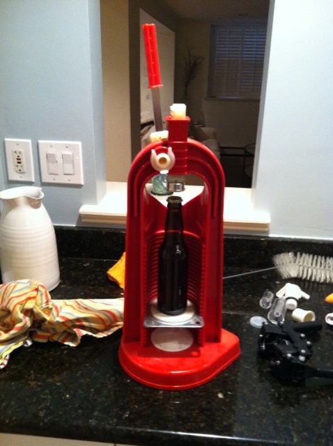 I have to say, bottling is my favorite part of brewing, maybe it’s because it is the most active part of the process. One by one we sterilized the new empty bottles I purchased (some people use empty bottles after they have drunk their store-bought beer, but because it was my first, and perhaps only batch, I wanted the bottles to be neat and free of label residue from their former life) and filled them up with my brew. I then used a red bottler to seal the bottle top on. Using the bottler took a little bit of effort, but not enough to tire from (even when bottling two cases of beer). I got a huge sense of satisfaction with every “THWAMP” the red contraption made.