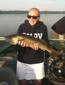 That next morning it struck me that you have to really like your fishing partners. When you are up way too early, and the coffee (or diet coke in my case) has not kicked in yet, you have to be comfortable with the silence of the lake, and the people around you. Again, we waited…and waited. We did get some nibbles; the walleye (the indigenous fish) seemed to like the worms and leaches we used. Suddenly, John yelled that he had something, and too quickly for me to even think about protesting, he urged me to come over and reel in whatever was on the end of his line. As soon as I had his rod in my hand I knew whatever was on the other end of it was big. John had to instruct me on how to reel in a fish this large, and it happened so fast that I don’t quite remember how I did it. Little by little I pulled the fish closer and closer to us and to the surface of the water. He (or she) appeared as a shadow initially, and then we could see his shape, size and scales, and John caught him in a net.