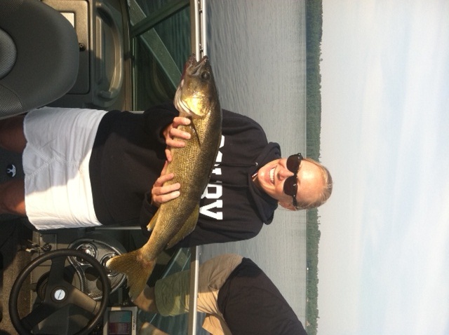 It was a big Walleye! John measured and he was more than 26 inches long. John held him with one finger in his gills and invited me to grab him. I wasn’t sure if I was ready to stick a finger inside a fish so I took him from John with both my hands wrapped around his belly. After we took a picture, John took my fish, bent over the side of the boat, held him right under the surface of the water to revive him. Once the walleye was moving John released him and he disappeared into the water.
