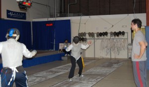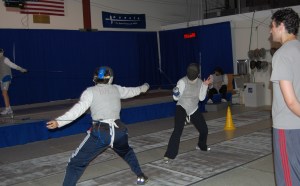 I started my evening of being en guard” with a private lesson with Adam, one of the club’s instructors, whom was a collegiate fencer and is a great teacher. We went over the basics including the three styles of fencing (foil — which I would be learning — sabre and epee), where I should be aiming (the upper torso) and how one scores (in foil, just a clean touch with the tip of the blade). He outfitted me in all the necessary gear and I stepped on to the strip (the area that acts as the boundary in which one fences).