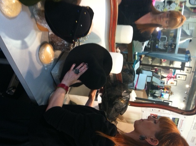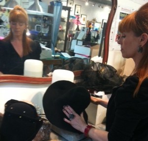 Marie was already living in Boston when she started her love affair with hats. She could not find any schools or milliners to learn from, so she bought old books on millinery and taught herself. Many of the materials and equipment she needed were not available in the States, so she had to order them from the UK, the mother land of millinery. It was a hard road, but hat-by-hat she got better and better. Today she executes her designs in the back of her boutique which looks like the Santa’s workshop of hats with Marie as the one and only elf.
