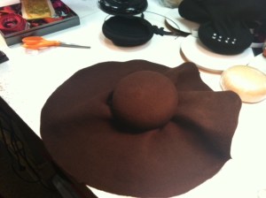 To celebrate the start of Fashion Week and because we are inching our way into fall (I am shedding a tear as I type this), Marie thought I should try my hand (literally) at making a beret. Marie makes each of her hats by hand and it can take days to complete one piece. For this beret we started with felt, sounds simple enough right? Wrong! The felt, has to be flexible enough to be stretched over a form. To do that, Marie steams the material until it becomes malleable. Marie holds the fabric over a steam machine that spits out boiling vapor, which can be a little tricky…seriously…I scalded my fingers. Next, Marie and I stretched the fabric over the beret form and pinned it in place. This typically has to sit overnight to fully take on the appropriate shape. Much like a morning show cooking segment, Marie had berets at different stages of development set up for me. So instead of coming back the next day, we cut off the excess felt and moved on to sewing a thin wire to the edge of another beret that had already been left overnight. We used a huge needle because the felt is so thick. Much like my upholstery projects, it was one of those moments that I wish I knew more about sewing. The wire gives the beret shape and we then covered our work with piece of glossy black grosgrain ribbon.