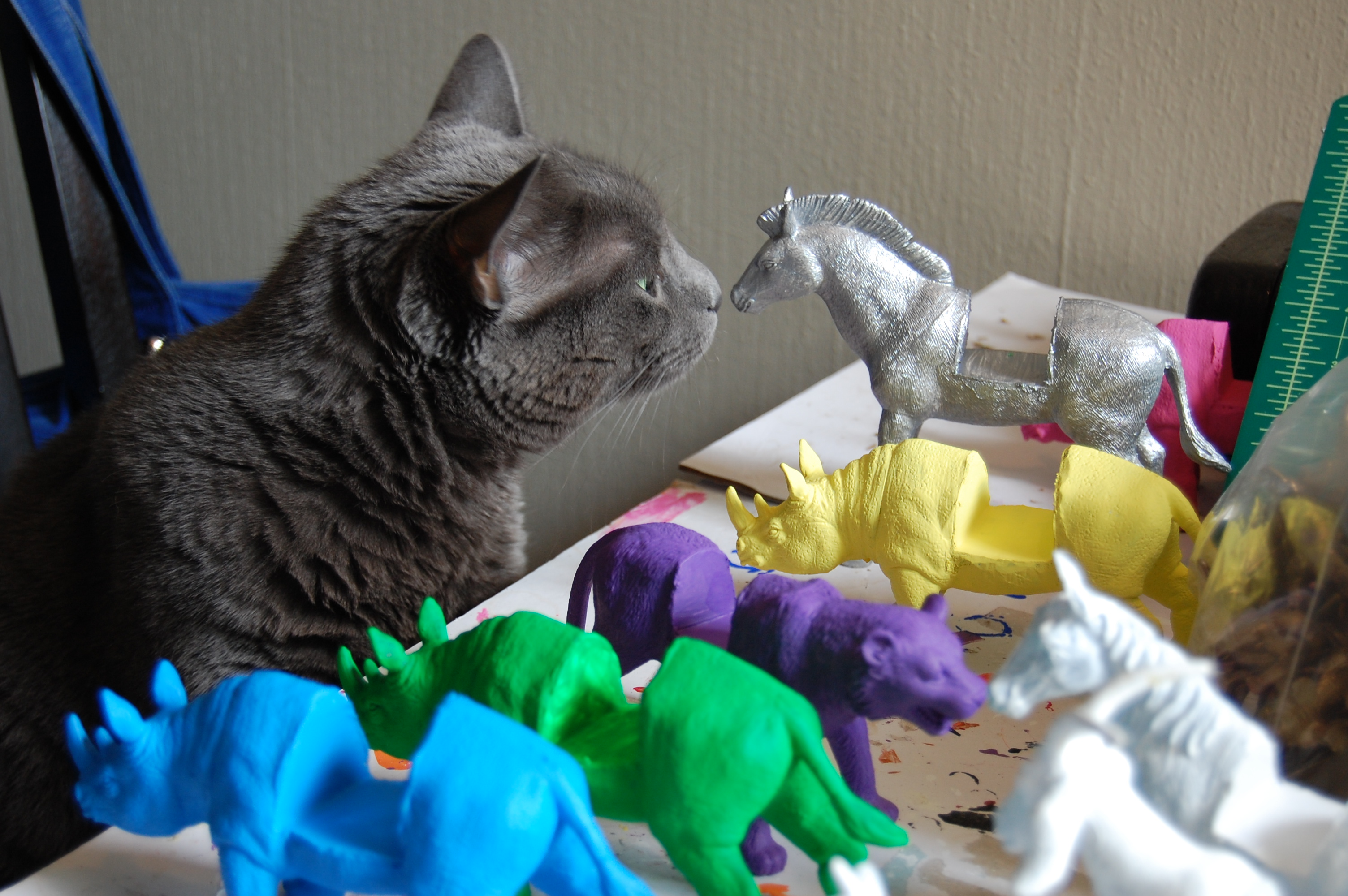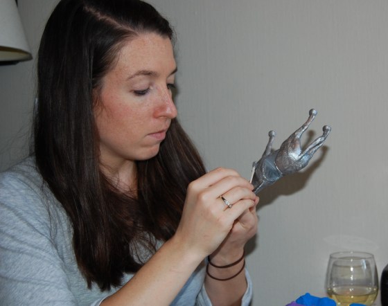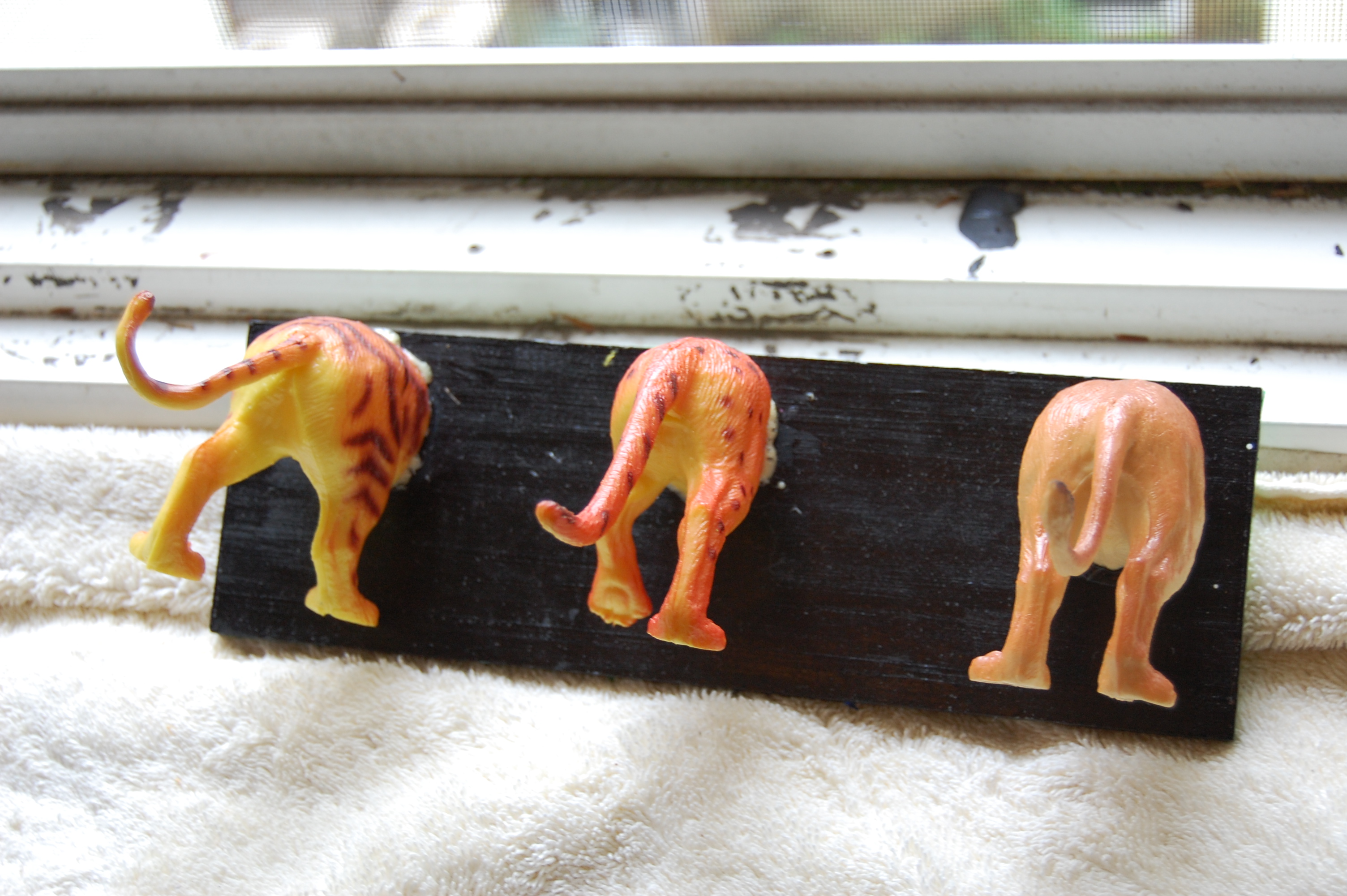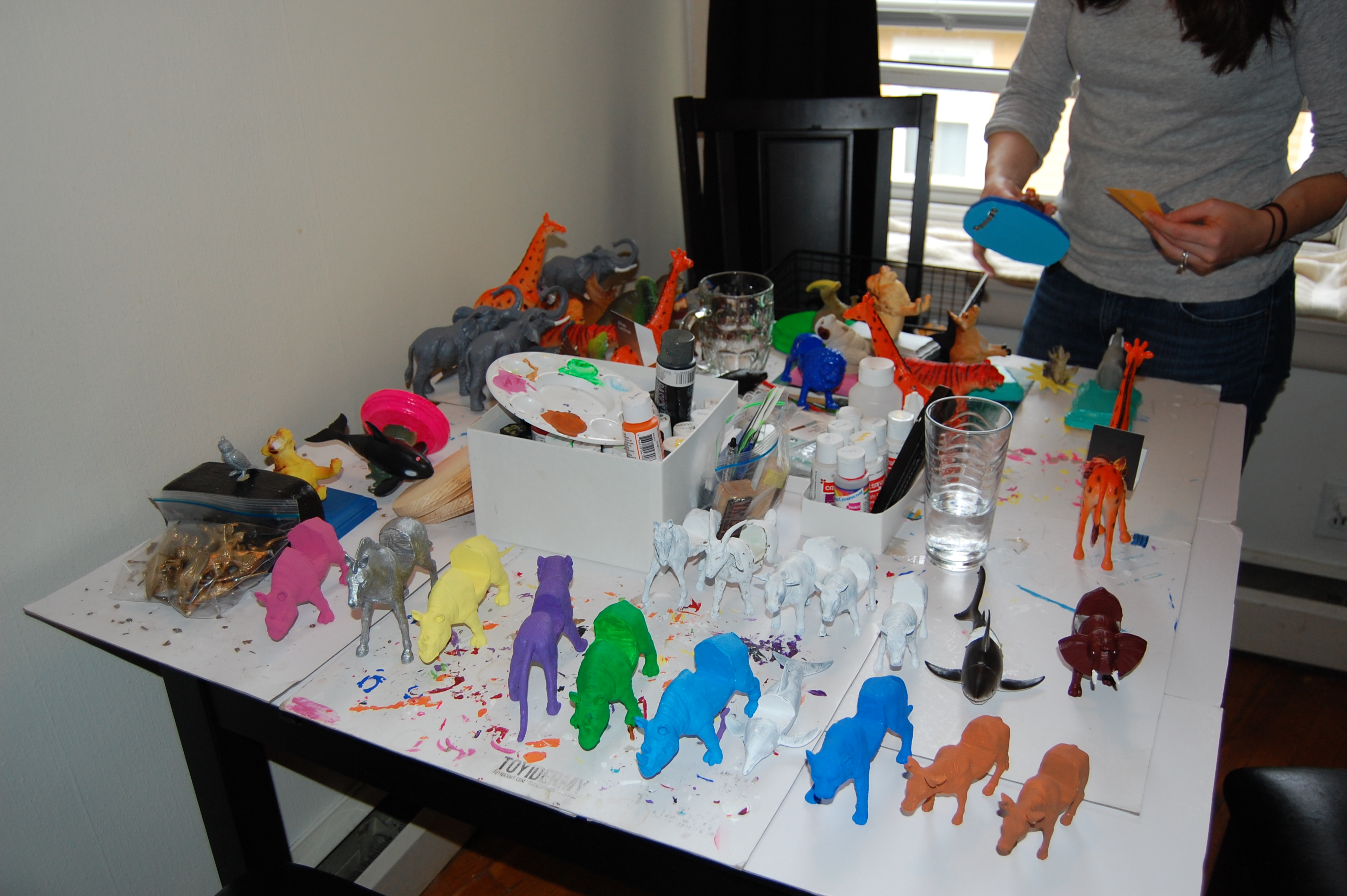What is Toyidermy you ask? Good question. To get the answer I spent Sunday afternoon laughing and crafting with the creator of Toyidermy; the blogger and my friend, Kelly McAuley. In the simplest terms Toyidermy is like taxidermy, but with toy animals instead of dead ones. Kelly’s creative juices started flowing after she saw a set of golden animal place card holders for sale at Anthropology. Crafty since childhood, the set’s price tag made Kelly wonder if she could make her own. She purchased a jug of rubber animal toys and got to work. She dubbed the result Toyidermy, and her creations are sweeping, if not yet the actual world, at least the etsy world!