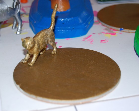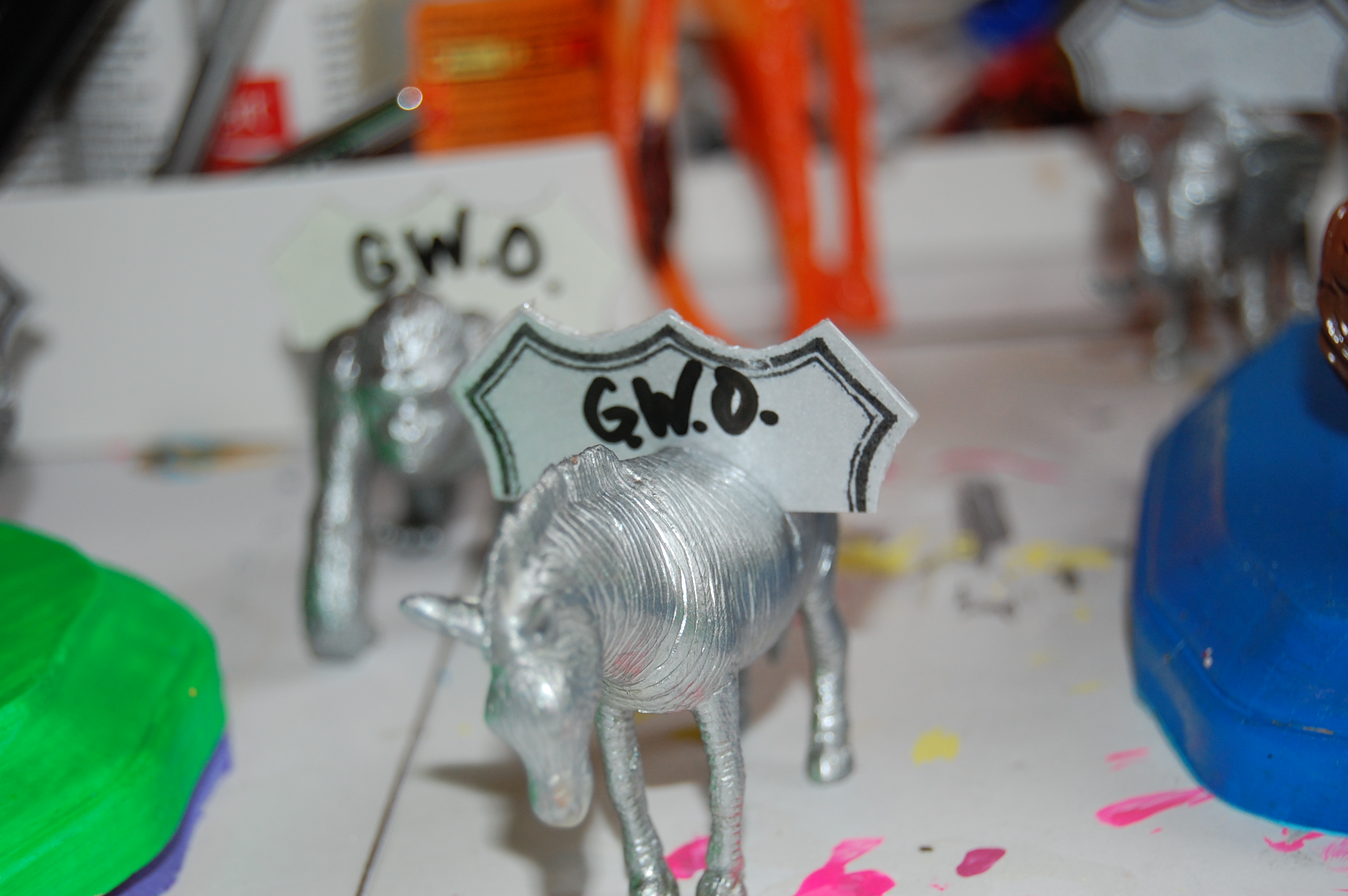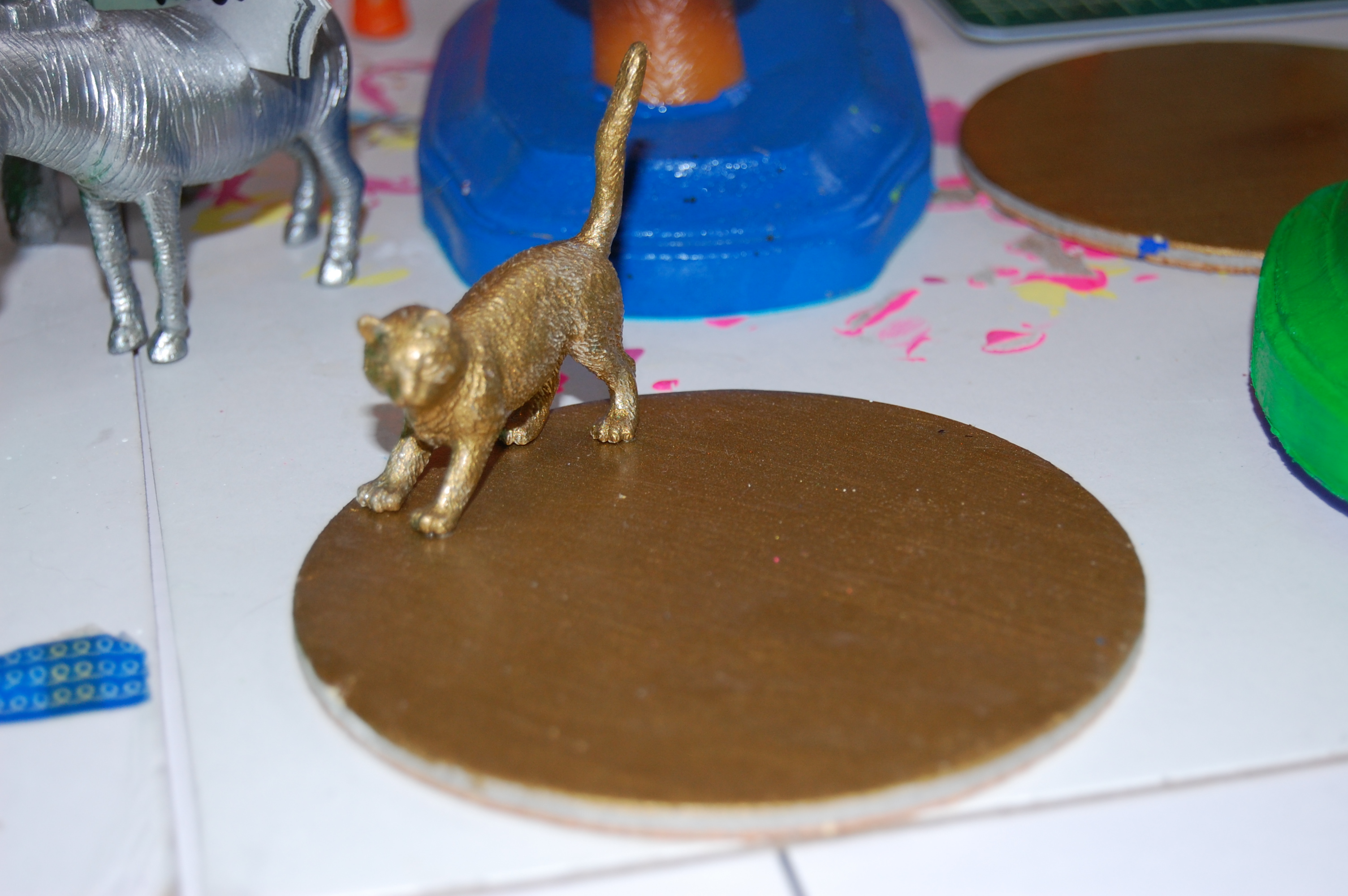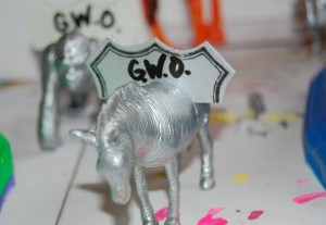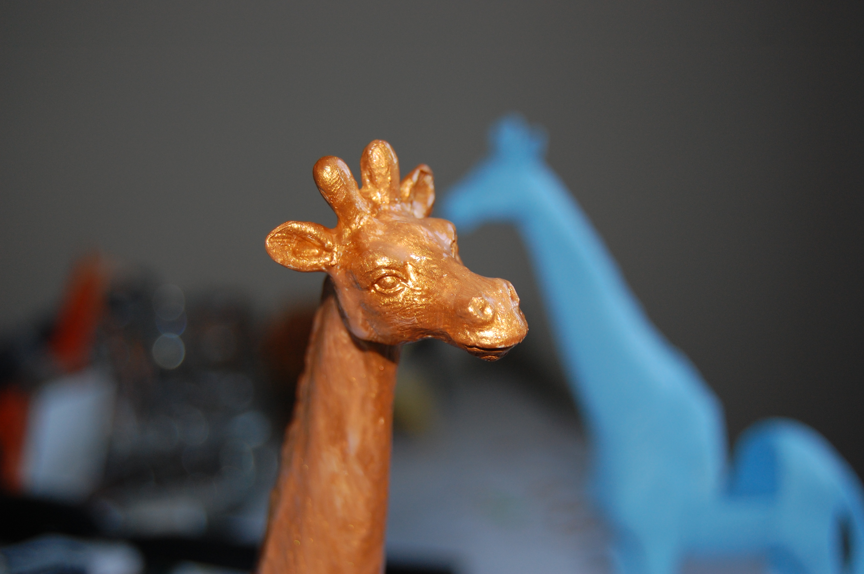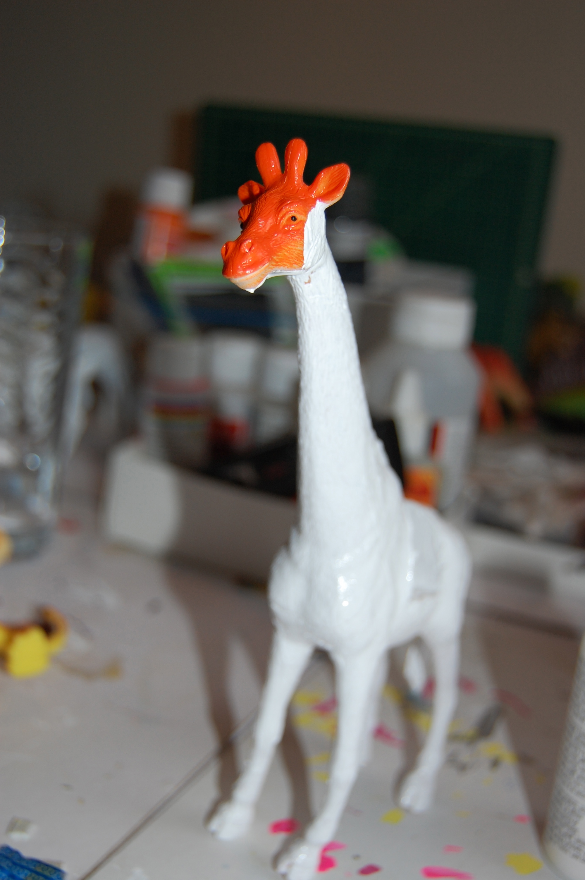 We created a shelf-like back section to hold the business cards and then started to paint! First we slathered on a white base coat, let it dry while we sipped some bubbly, chatted and touched up some other member’s of Kelly’s menagerie. Then the tough part: choosing the perfect color for my toyidermy masterpiece. I went with a metallic gold, which I am loving, but Kelly has every color of the rainbow and then some. While I managed to get paint all over myself, I was also able to coat my giraffe as well.