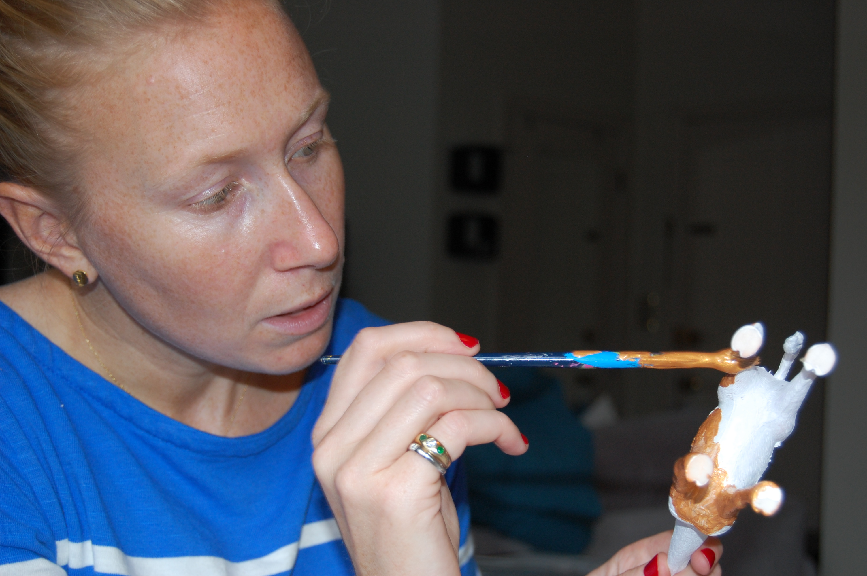 We started by doing a little surgery on my own personal Sophie (please note, no plastic animals were killed in the writing of this blog). This was more challenging than it sounds. I learned I am not the most graceful or efficient with an exacto knife. I got a little intense while sawing my giraffe, which made both Kelly and me laugh once she broke me out of my stress-trance. Leave it to me to get bent out of shape over a rubber animal. But I snapped out of it, and quickly got back to having fun.