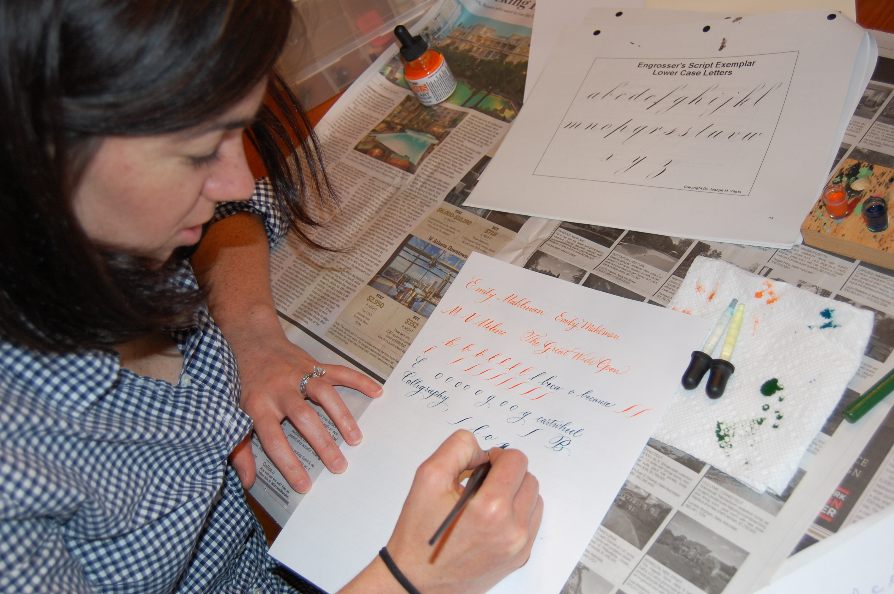 I walked into a calligraphy lesson with the lovely and talented Mindy Barber not realizing how much of an art calligraphy actually is. Mindy has always loved handwriting and had a calligraphy set as a child. She taught herself some techniques, and then, as an adult, built upon that foundation through lessons with accomplished calligraphers, including a “Master Penman” (how’s that for a title?). Mindy now practices for her own enjoyment, and also creates beautiful wedding invitations and envelopes for family, friends and those lucky enough to fit into her busy schedule (she has a wildly successful full-time career as well). Her calligraphy has appeared in Town & Country Weddings and the wedding website The Knot.