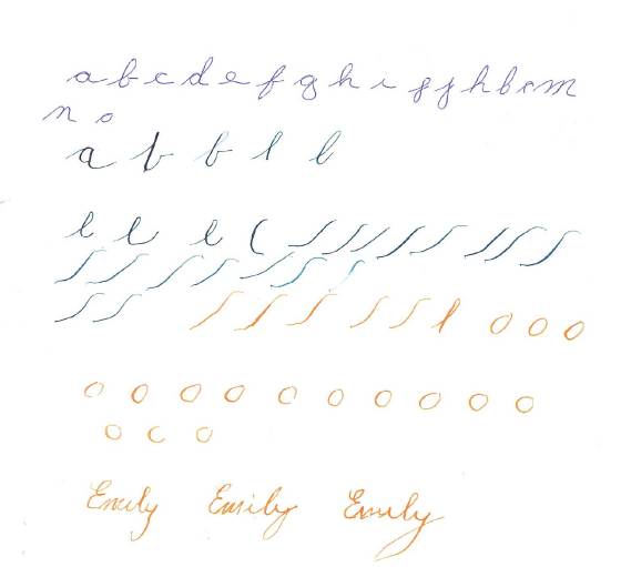 My light-bulb moment came when Mindy explained that many master penmen consider calligraphy an art form; in this vein we would be drawing letters, not writing them. This made me feel much better about struggling with an act that I do every day of my life. If calligraphy is an art, then it’s only logical that it requires instruction, talent and a great deal of practice. I watched Mindy elegantly move her pen across the paper. She briefly picked it up off the paper over parts of certain letters that serve as contact points of multiple pen strokes (like the middle of an “f”) so that there would not be a blob of extra ink to mar the letter. This is just one example of the subtle skill needed to draw beautiful letters. Mindy has been practicing for years, making me feel silly to think I would be able to succeed after just one lesson.
