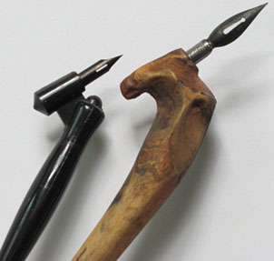 First Mindy introduced me to all the tools we would use during our afternoon of practicing calligraphy, including the pen holder; the long cylinder that a calligrapher holds in their hand (and that the rest of us would likely think was the actual pen). On the tip of the holder is the pen, which is removable and holds the ink until it is pressed to paper and the ink is released from the tip of the pen, or the nib. For our lesson we used an oblique pen, which Mindy said would allow me to better see the letters I was writing.