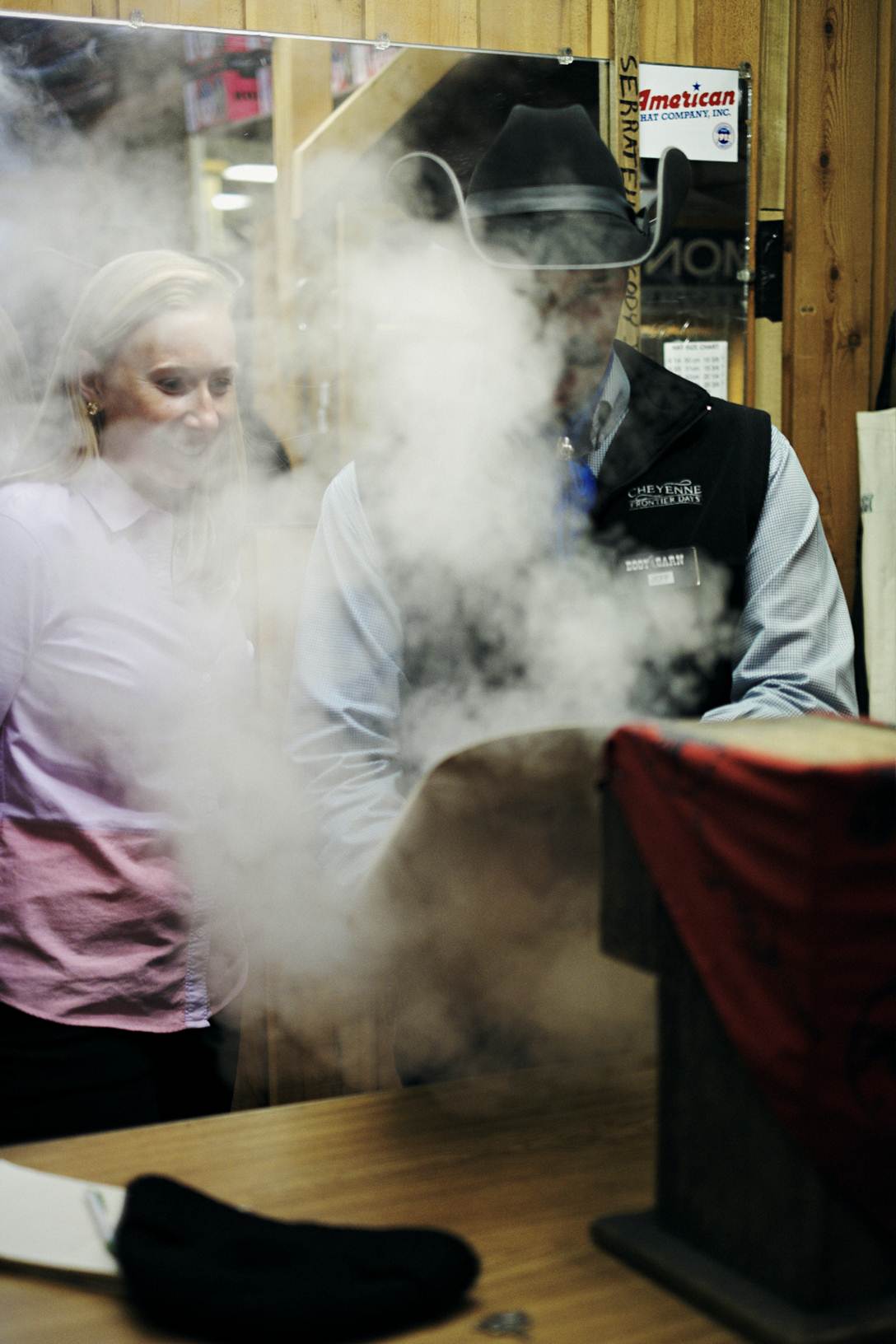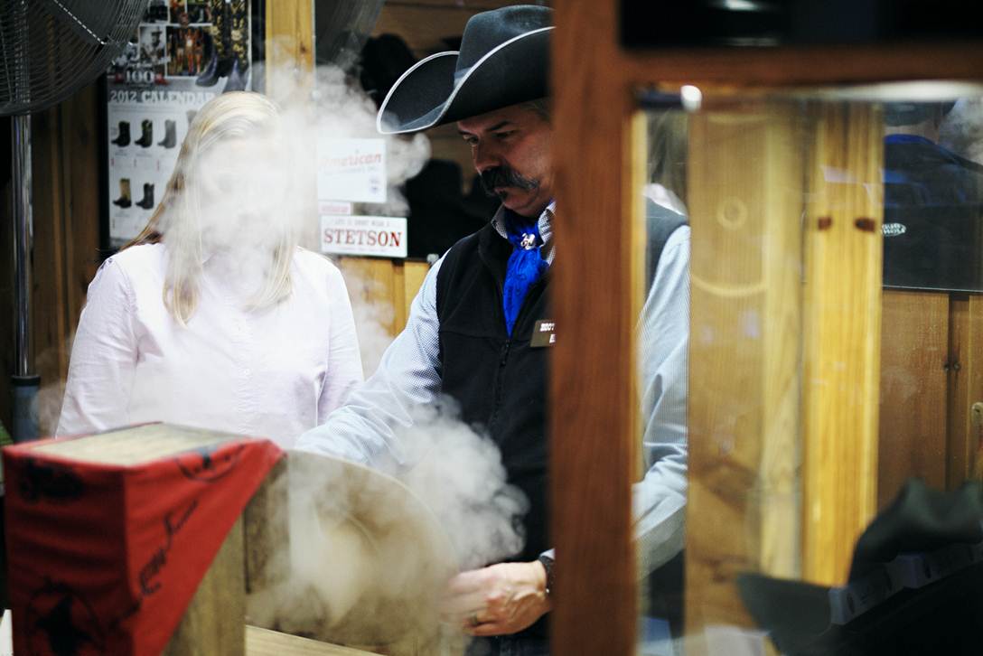 Cowboy hats are initially shaped to satisfy the style and shape requests of a customer. All hats initially come with a full, round, dome-like top and a perfectly flat brim. To steam the material Jeff held the hat close to the steam machine, at times moving his hand away when it got too hot (burning digits is an occupational hazard, he explained). As the material got softer, he used his hands to shape the brim (the curve of a brim should start in line with the wearer’s temples) and used his fingers to create creases and dimples in the top of the hat. There are three popular shapes: cattleman’s crown (which accounts for 65% of all hats sales), “brick top,” and “Gus.” After an initial purchase, hats can also be re-shaped throughout their lifetime to maintain its shape, change its shape, or if it gets squashed when you are bucked off a bronco (it seems that happens more often than an east-coaster would think).