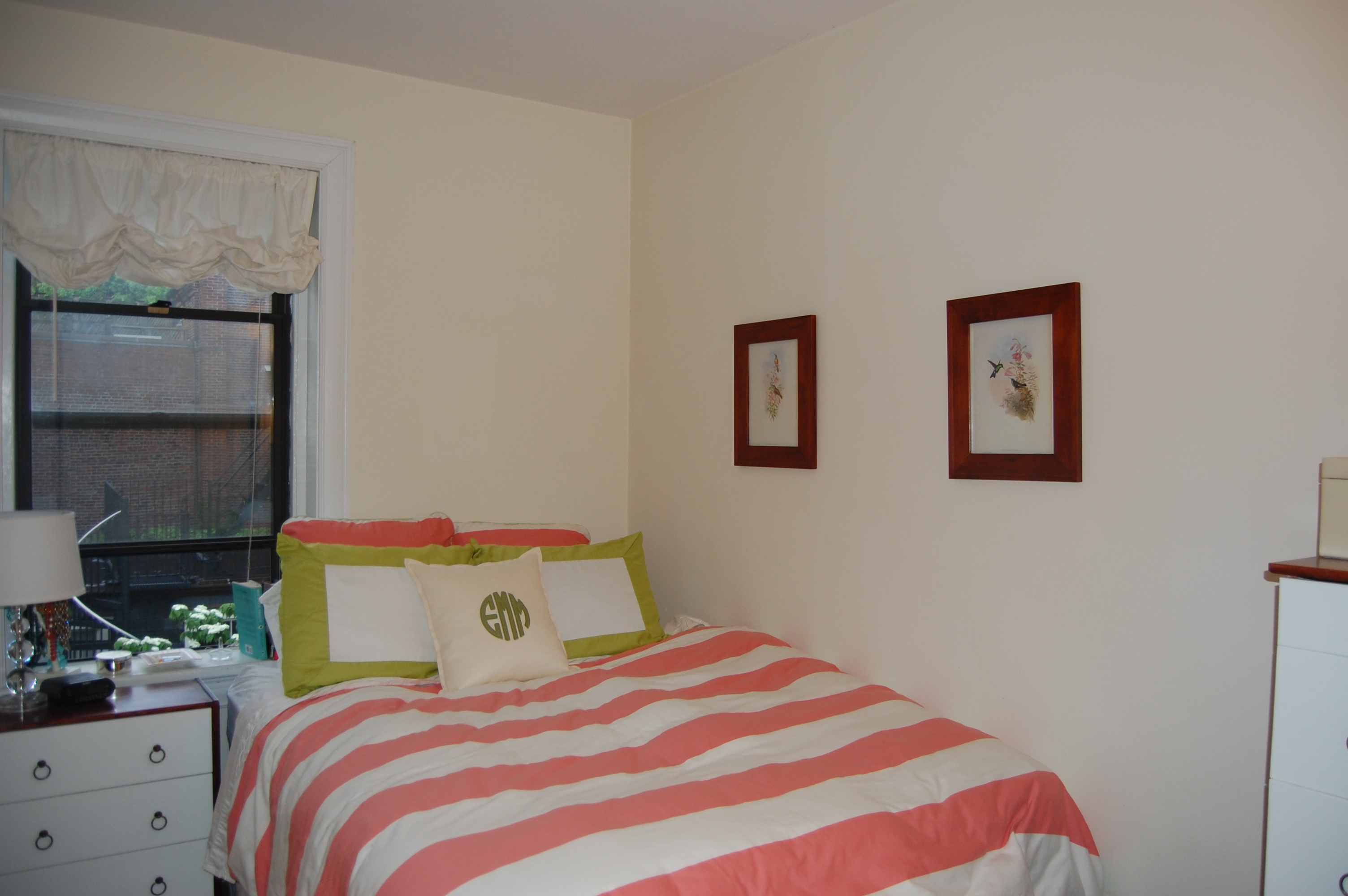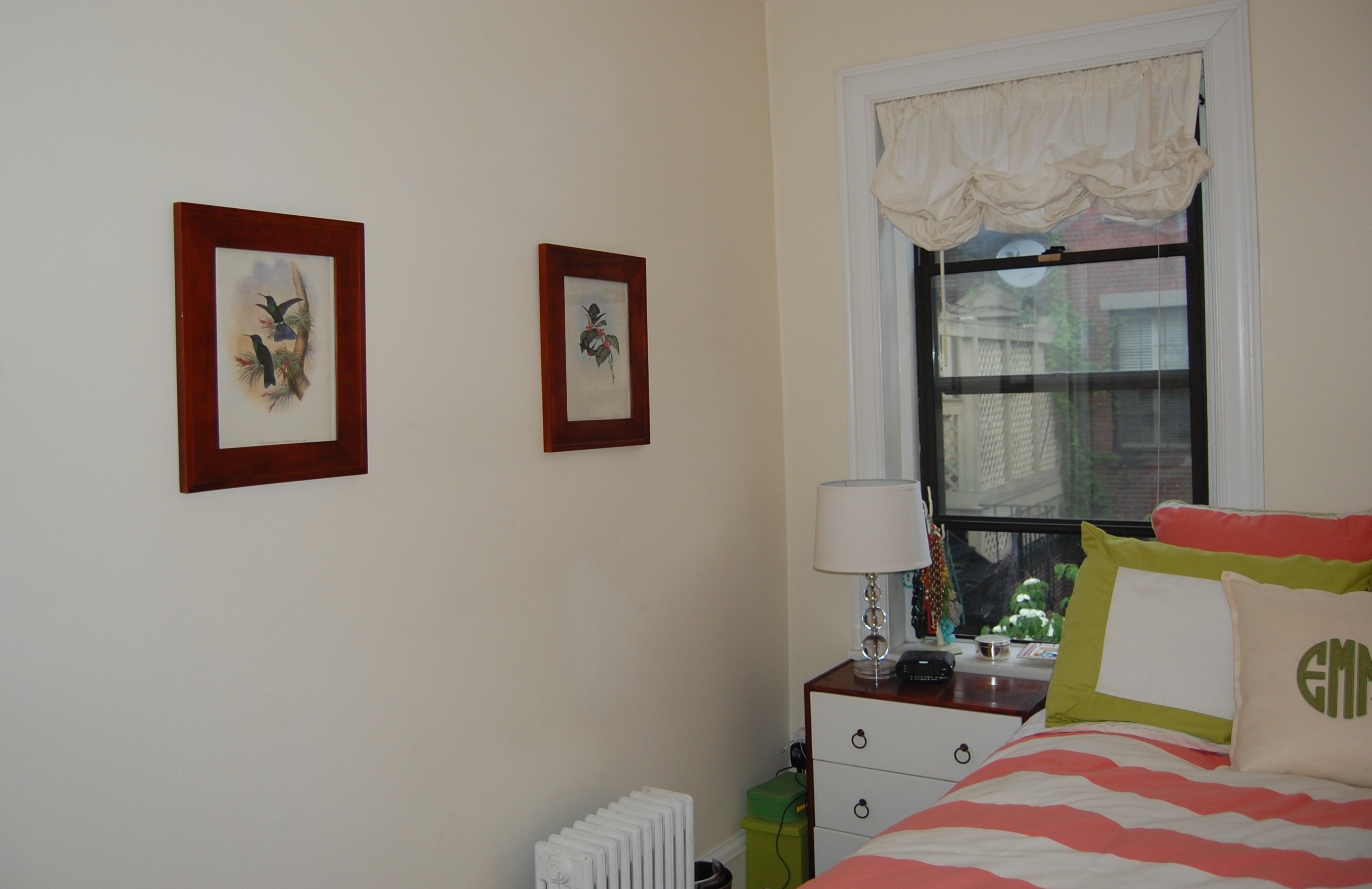 As you can see the shape of my bedroom (not to mention the window and radiator) doesn’t allow for many variations in terms of furniture placement. My bed could only really go one place, so there it is. I’m using the same Serena and Lilly bedding that I had in my last place, although with these eggshell colored walls (which sadly I am not allowed to paint) the pink and green seems a little bit more in your face than before, so I may change my bedding in the coming months.