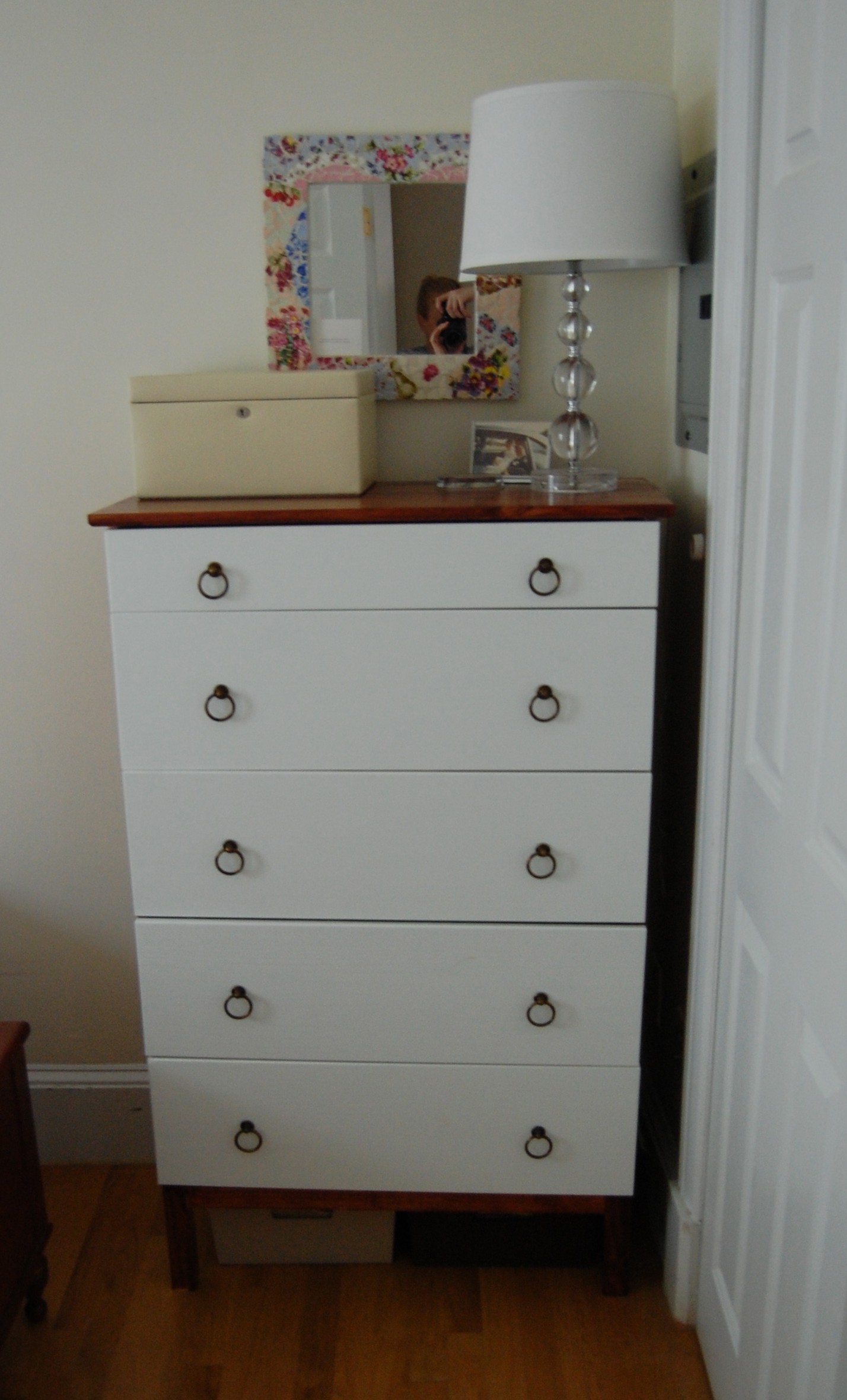 Buoyed by my success with the rast I braved the crowded maze that is Ikea again, determined to hack a matching dresser. I picked the “tarva” five-drawer chest. Things didn’t go as smoothly this time around. This piece really required a drill (which the instructions did not state, even if it did, I don’t own one), and after several hours I remembered why I stopped buying Ikea furniture: its assembly has the unique ability to make me feel stupid and weak at the same vulnerable moment. As an intelligent adult I should be able to follow the instructions that are laid out solely in pictures. But I couldn’t. After sitting on my floor crying for longer than I care to admit, I called in reinforcements in the form of my friend Chris, who saved me by putting the frame of the chest together. I had to be rescued again a few days later by my dad who brought his drill up from Philadelphia to help me assemble the drawers. Sometimes you just need a handyman…or handy men.