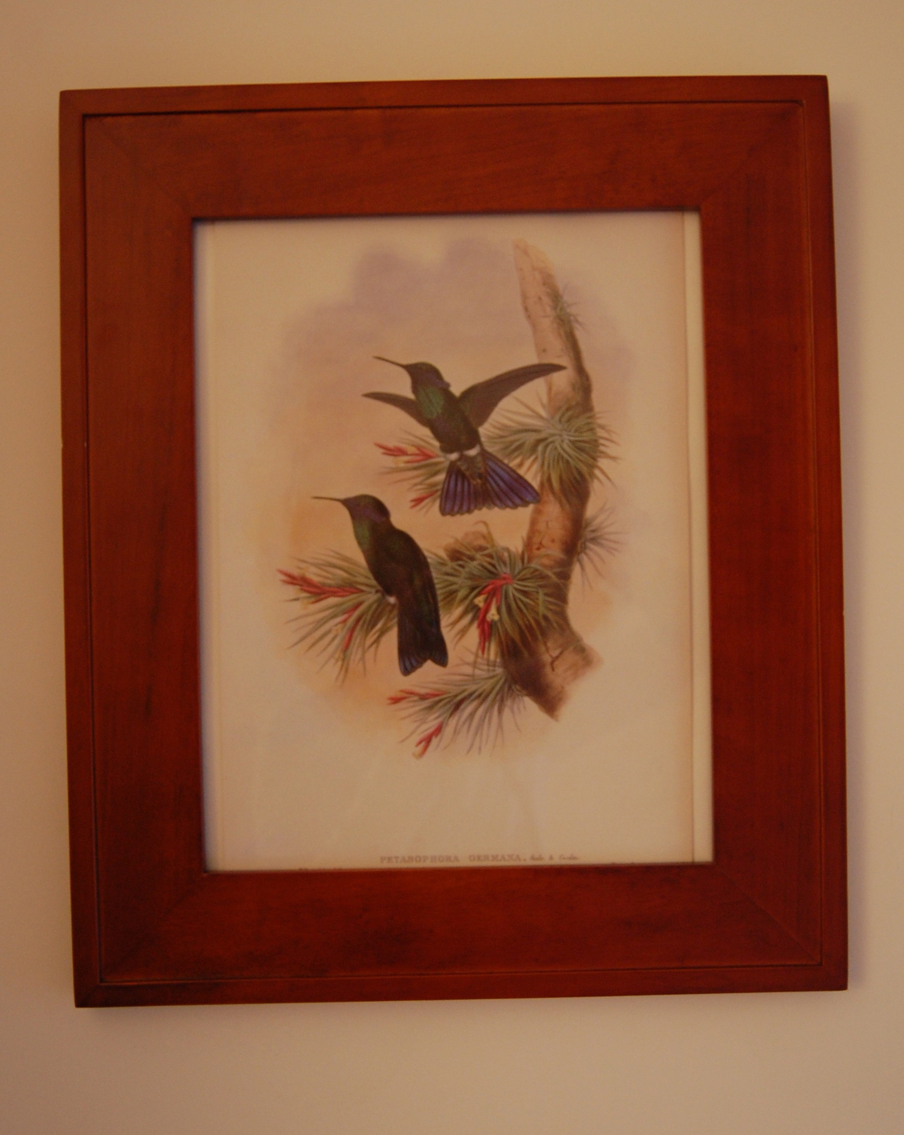 I found an old illustration of Columbia’s first campus (an ode to my J School days) in a goldish frame. After bartering its seller down, and re-stringing some twine for hanging, it has filled in the missing piece in my living room’s gallery wall. I also found four vintage bird illustrations, each had touches of pink so I hoped they would work well in my bedroom. They are an odd size so I got crafty late last night (nothing like a blog post deadline to end procrastination) to make them work in the frames I picked out. I used pop dots (my favorite crafty go-to) as spacers so the illustration appeared to hover above white textured construction paper I picked out. It makes them look more polished and makes my at-home framing job look more deliberate.