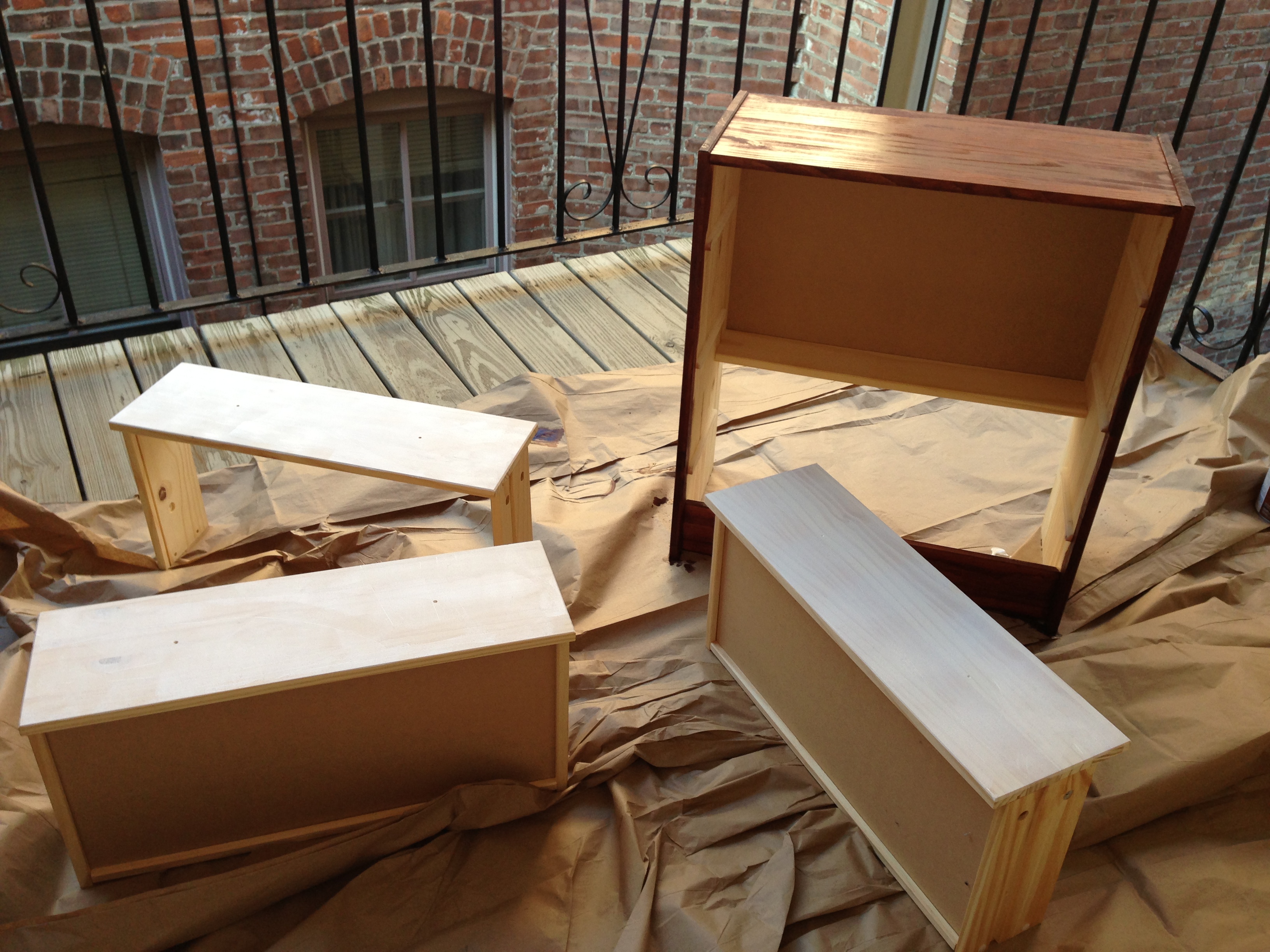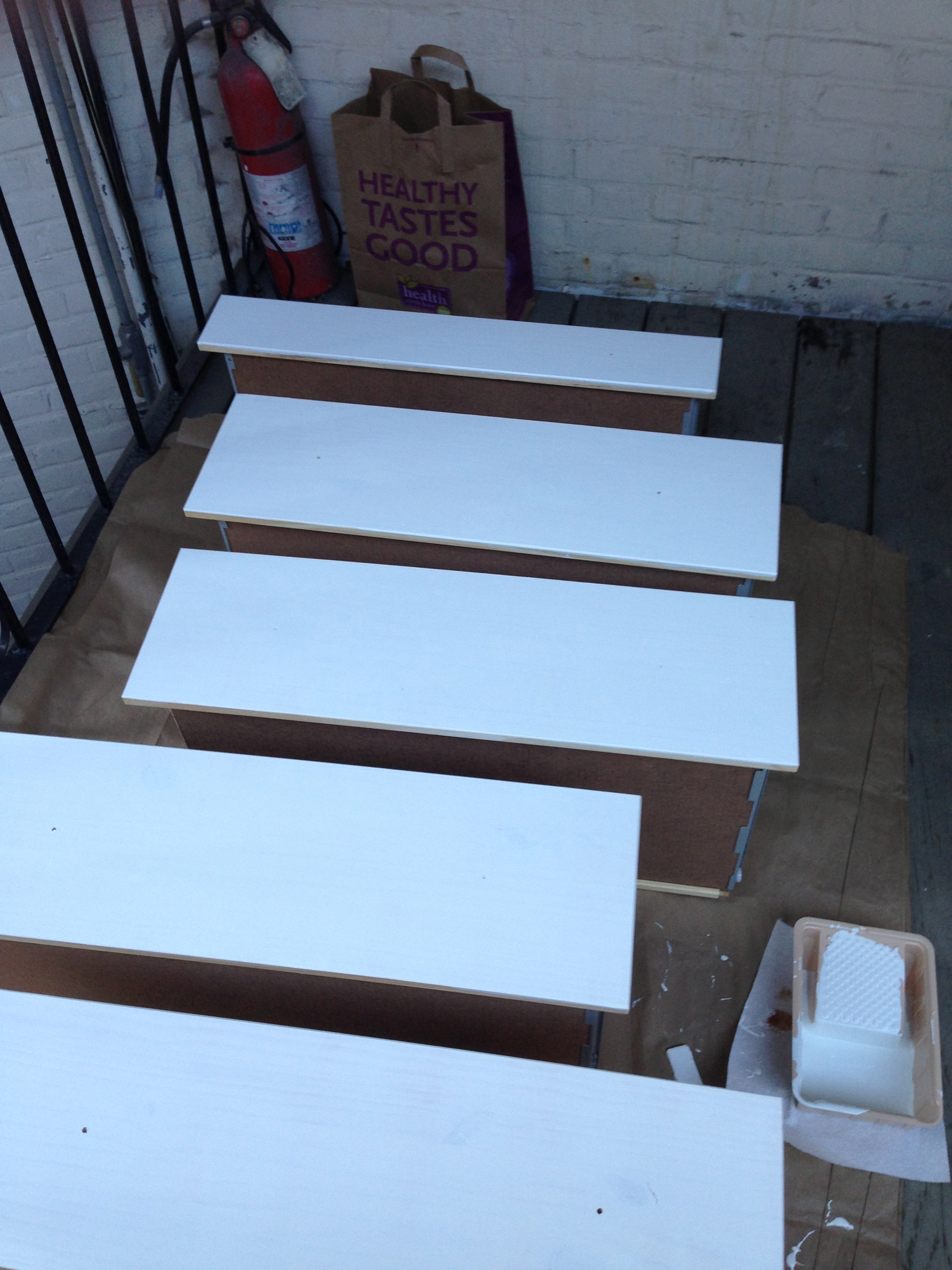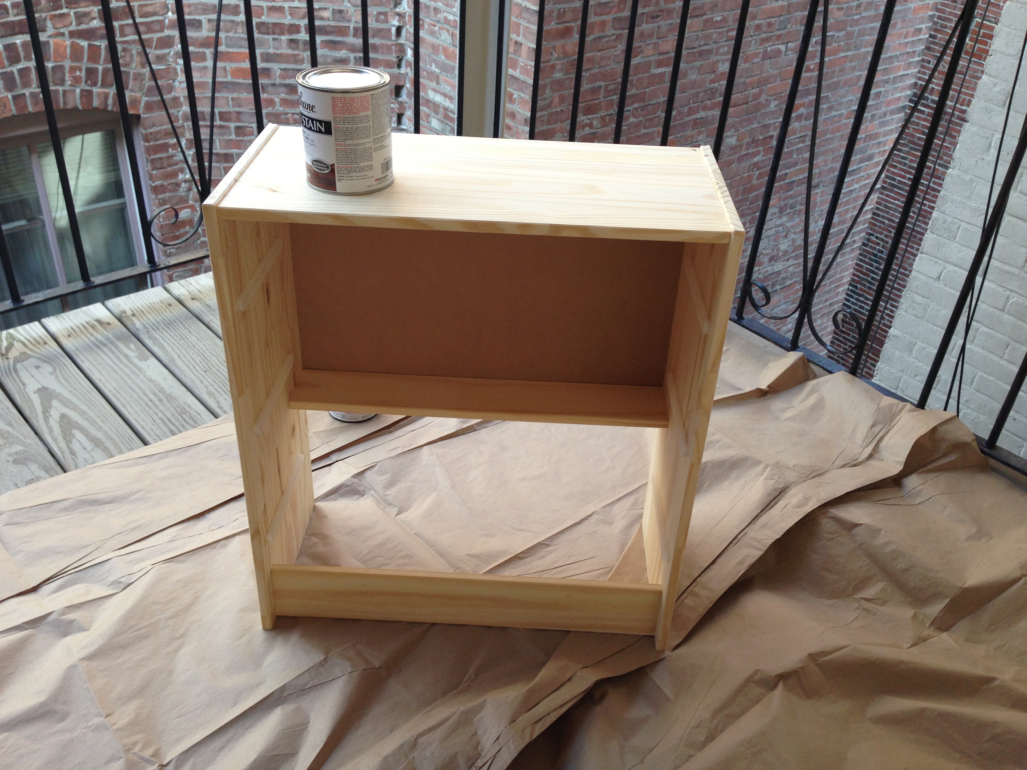 I started out with the rast table (above, at an amazing $34, I’ve paid more for a lunch). Sitting in my living room with a dozen pieces of raw wood covering the floor gave me terrible flashbacks of college, but it was an easy piece to put together, and I quickly moved out to the patio to paint (high gloss Chantilly Lace by Benjamin Moore), stain (“Red Oak”) and varnish what would become my bedside table. After a few coats I added some brass pulls from Lee Valley Tools (I cannot get enough brass these days). I think it looks great and at this price if I throw it out in a year when I fall in love with a real beside table it won’t own me anything.