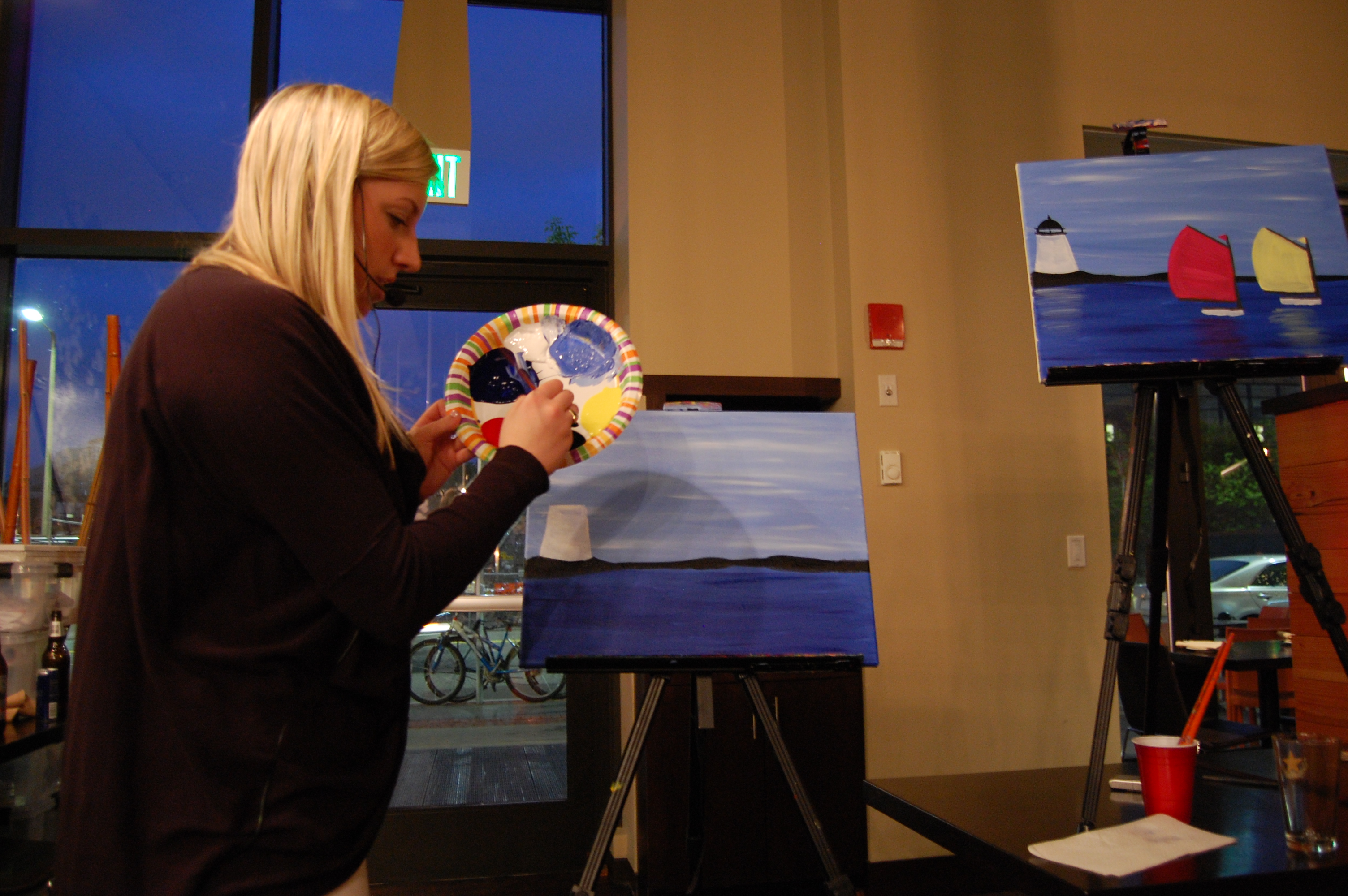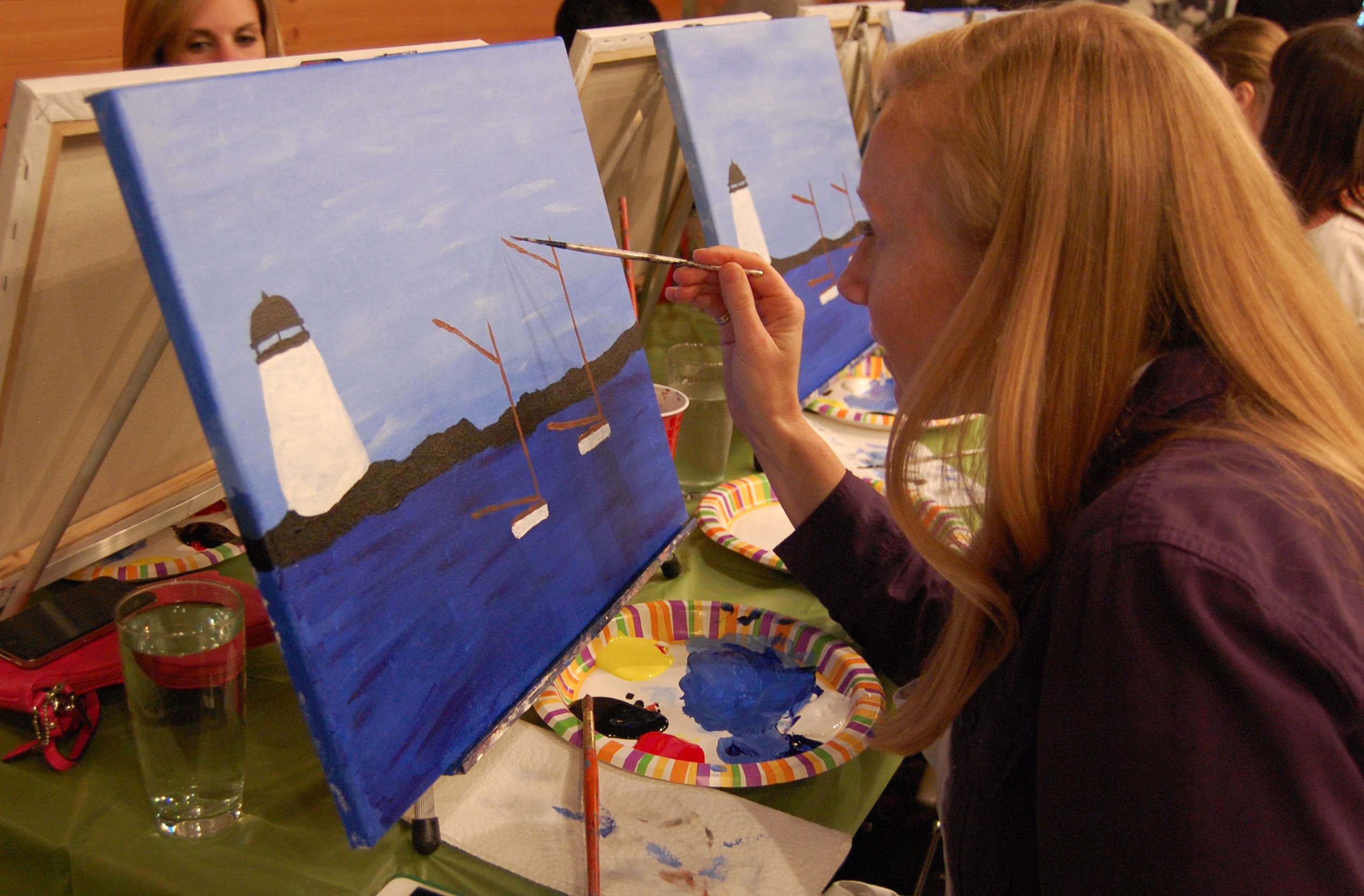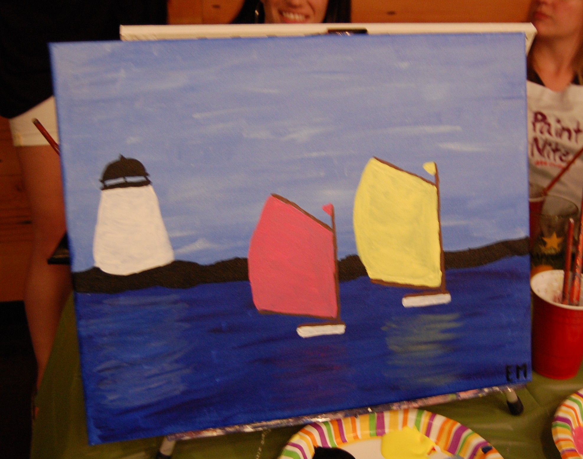 My first clue that this would not be a dark, hipster, artsy night was the artist who would be leading us in our sailboat soiree. Erica Pearson was cute, personable and not dressed in all black. She led us step-by-step through the painting, pausing to work her way around the room as we completed the water or a sail. I had my doubts, but it was actually fool-proof, literally. My stick figures are nothing to write home about, but whether it was Erica’s explanation or demonstration (or maybe I was touched by divine artistic intervention) I was able to paint the heck out of those sailboats, the water and even the reflection of the sails against the water. The latter was the most difficult part of the painting and required a very specific water-to-paint ratio on the brush. I may have let out a squeal of frustration, but Erica and Diana we able to talk me off my oil-paint covered ledge.