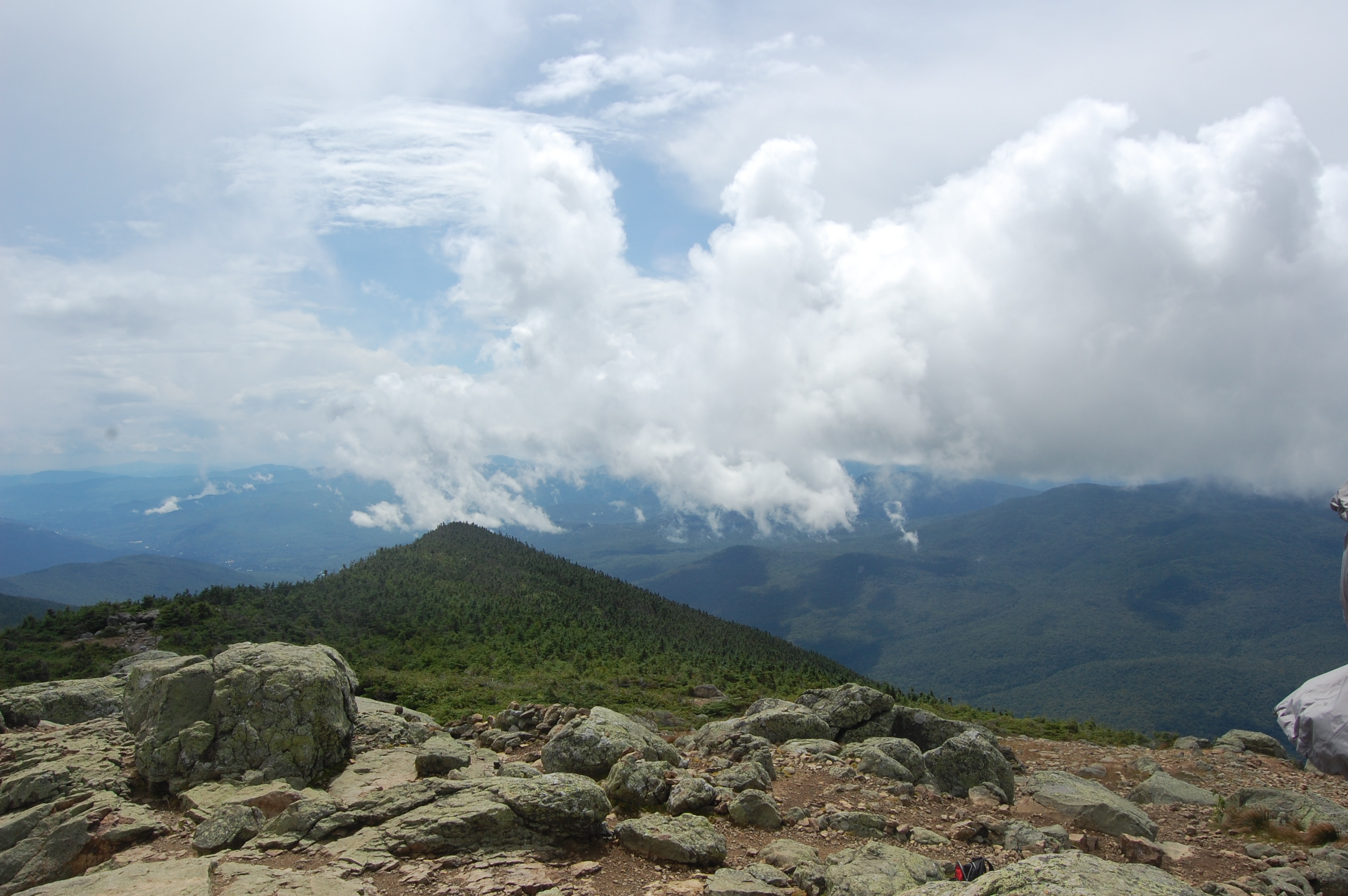 But Corey verbally whipped us back into hiking shape with “We have to summit something.” Did we…really? But summit we did. We “tagged the top” (even if I’m not outfitted like a hiker at least I can use their lexicon) of Little Haystack after more than three hours. The panoramic views of the White Mountains were amazing, and watching the rain fall on different parts of the terrain was really cool.