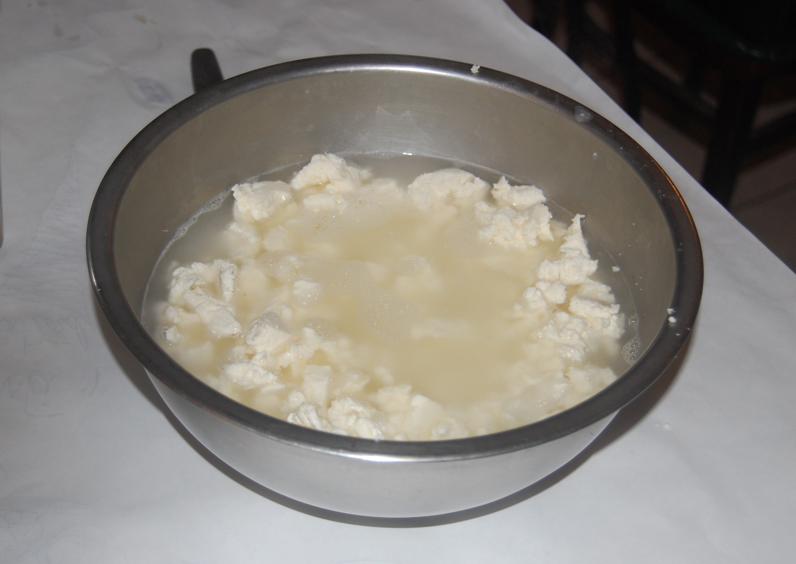 Next we gently formed a large ball with the cheese, and pinched off balls of various sizes into a bowl of cool water, where it sits until it is ready to serve.