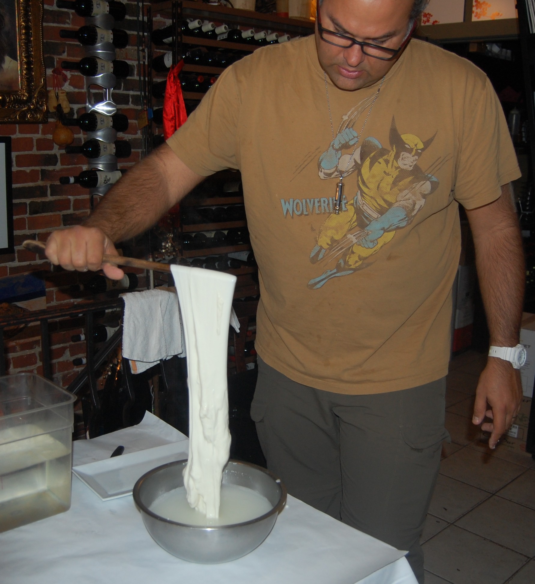 Next I got to see how mozzarella earned its name. We used the handle of a wooden soon to stretch the cheese. It became silky looking, almost like taffy.