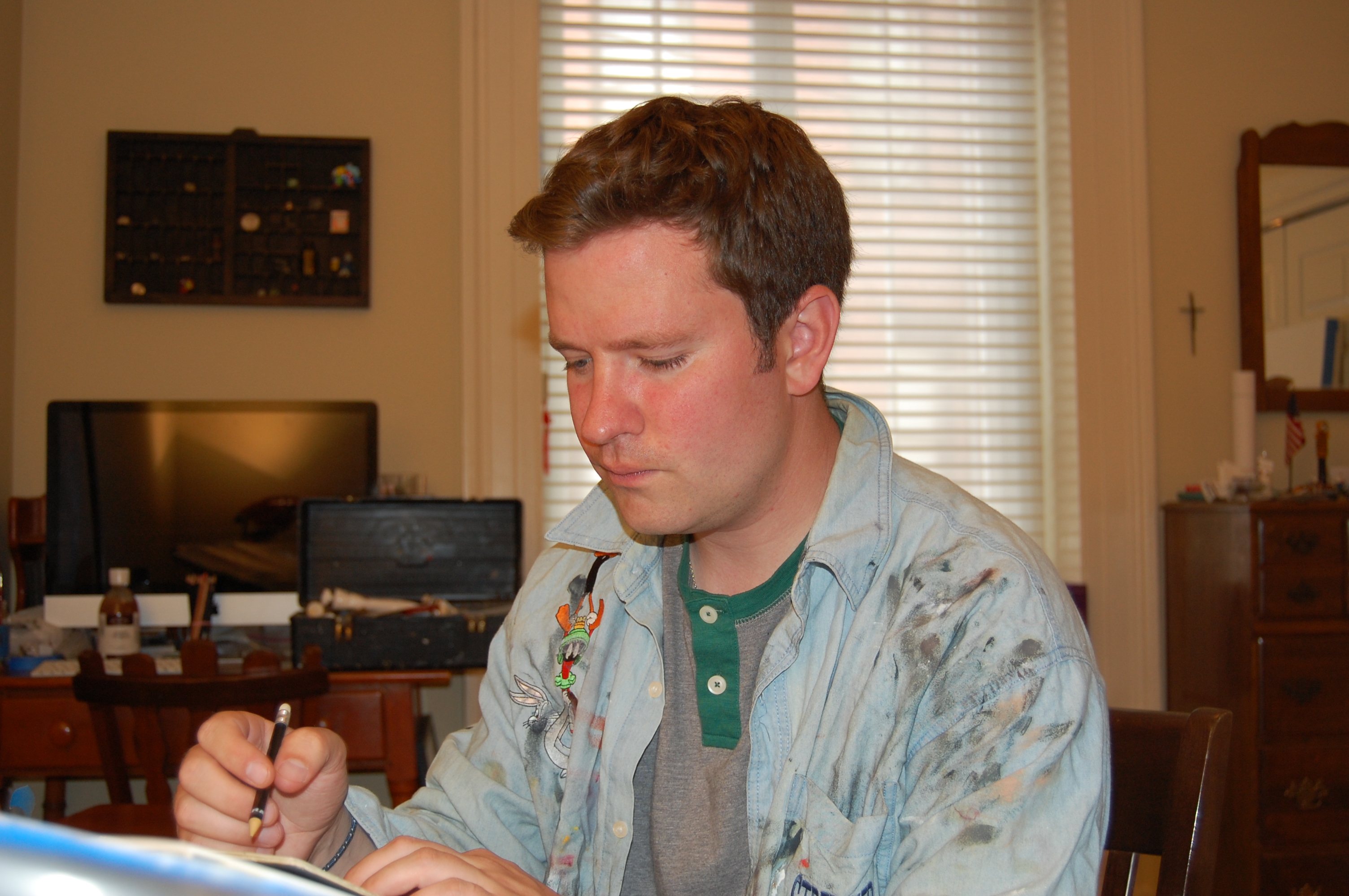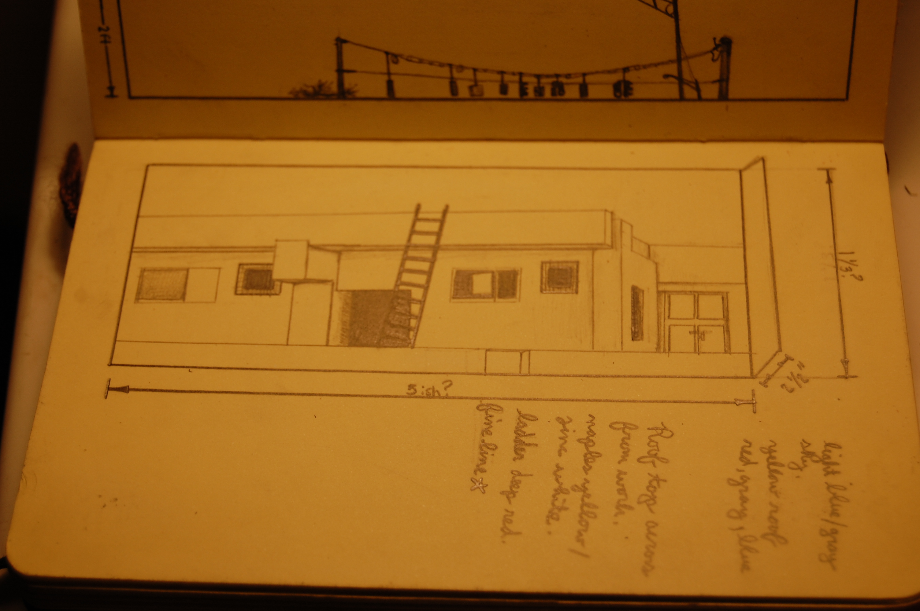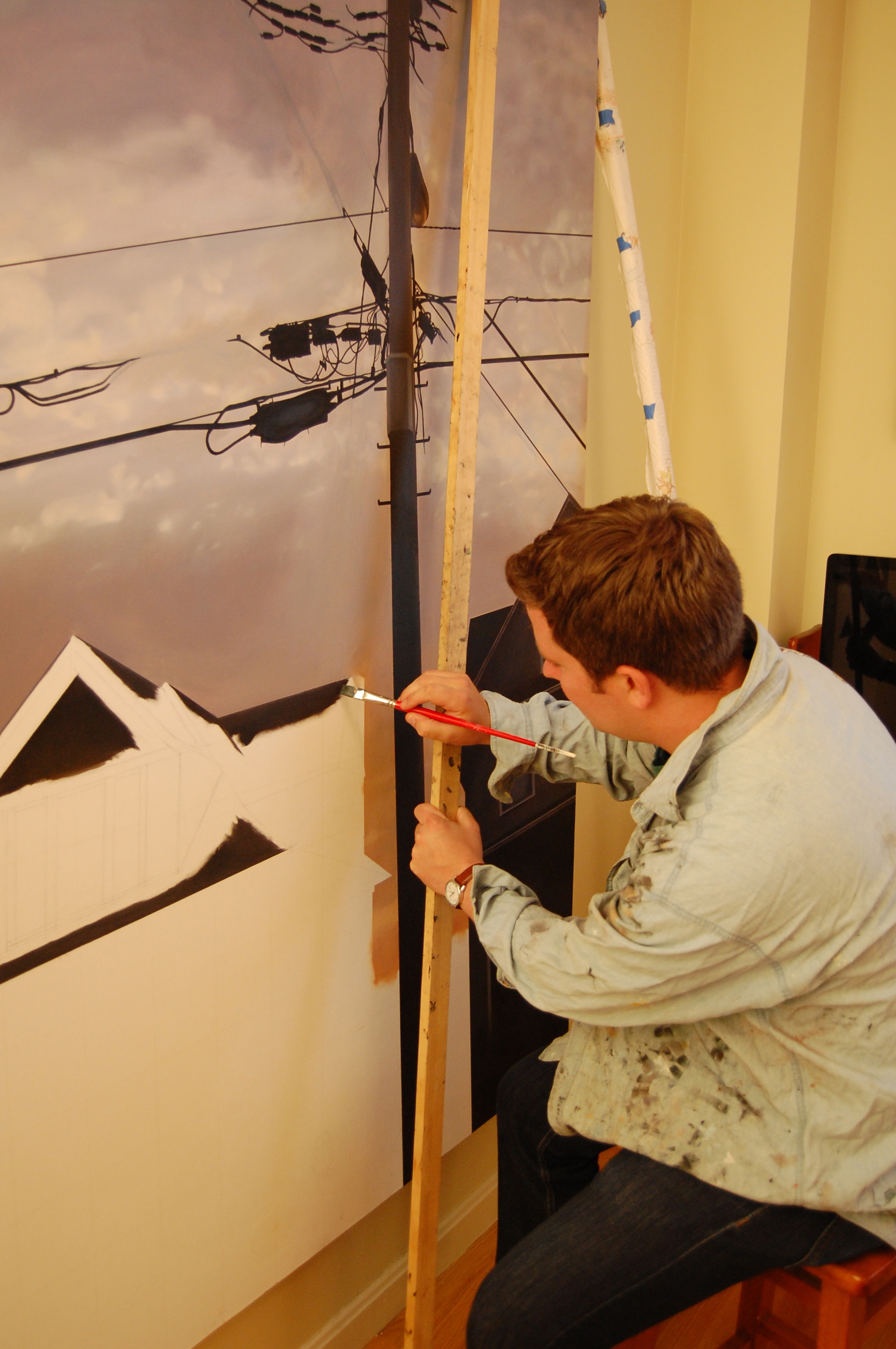 In complete opposition to the way I image people painting (“happy little tree” style), Patrick’s work is very studied, with sketches and meticulous planning. It reminds me of one of my favorite artists (and one of Patrick’s as well, no wonder), Edward Hopper. Hopper created dozens of “studies,” or sketches, of different parts of a painting (a couple sitting at a lunch counter, the glow of the street light outside the diner) before he painted the finished piece. I saw an exhibit of Hopper’s studies years ago at the Whitney, and it made quite an impression. Like Hopper, Patrick’s work is detailed, in its preparation and execution. Why does he go to these lengths? “I have to get it right,” he explained to me. Sound familiar? I may have found the most Type A artists out there. How appropriate for me and this blog.