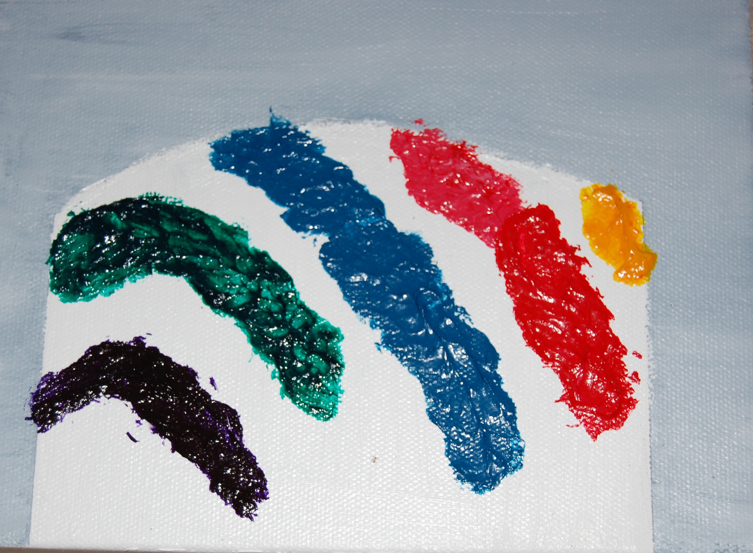 I used his photograph as the basis for my painting. Patrick encouraged me to use tape to make sure the lines that would create the sides of my gas tank were completely straight, very much his style, which includes measuring and tracing on the canvas before ever picking up a brush. Once I got my soupy grey background done, and the solid white of the gas tank, it was time to get to the color. That’s when my lack of artistic skill gave way to the strategizer inside me. My painting was not going to turn out well at all if I relied solely on my non-existent skill. So when Patrick offered some heavy gel to thicken the paint, I had a light bulb moment. If I glopped the paint on my canvas, it may look like the large strokes of Corita Kent’s gas tank, without me trying to duplicate the exact strokes.