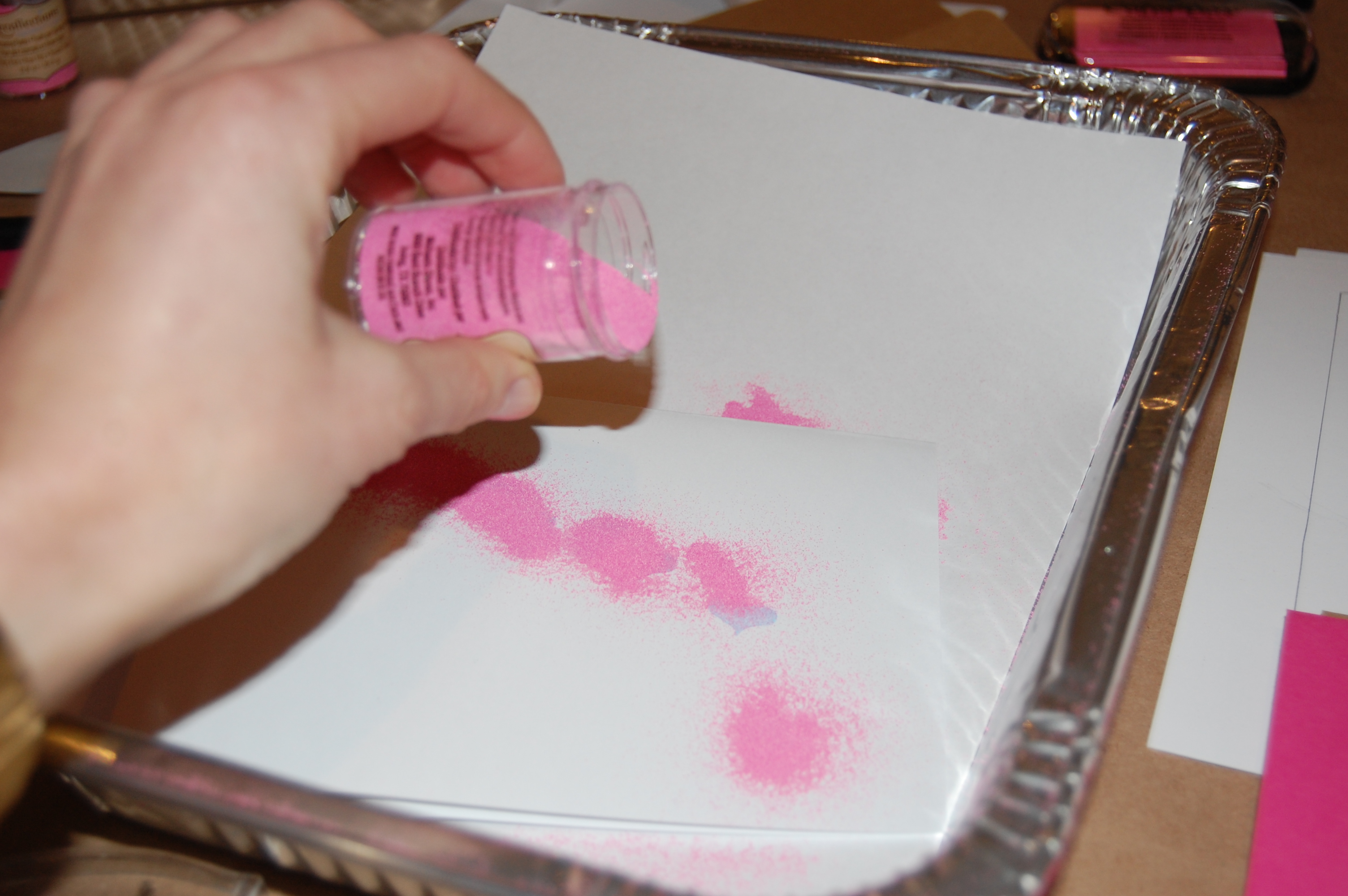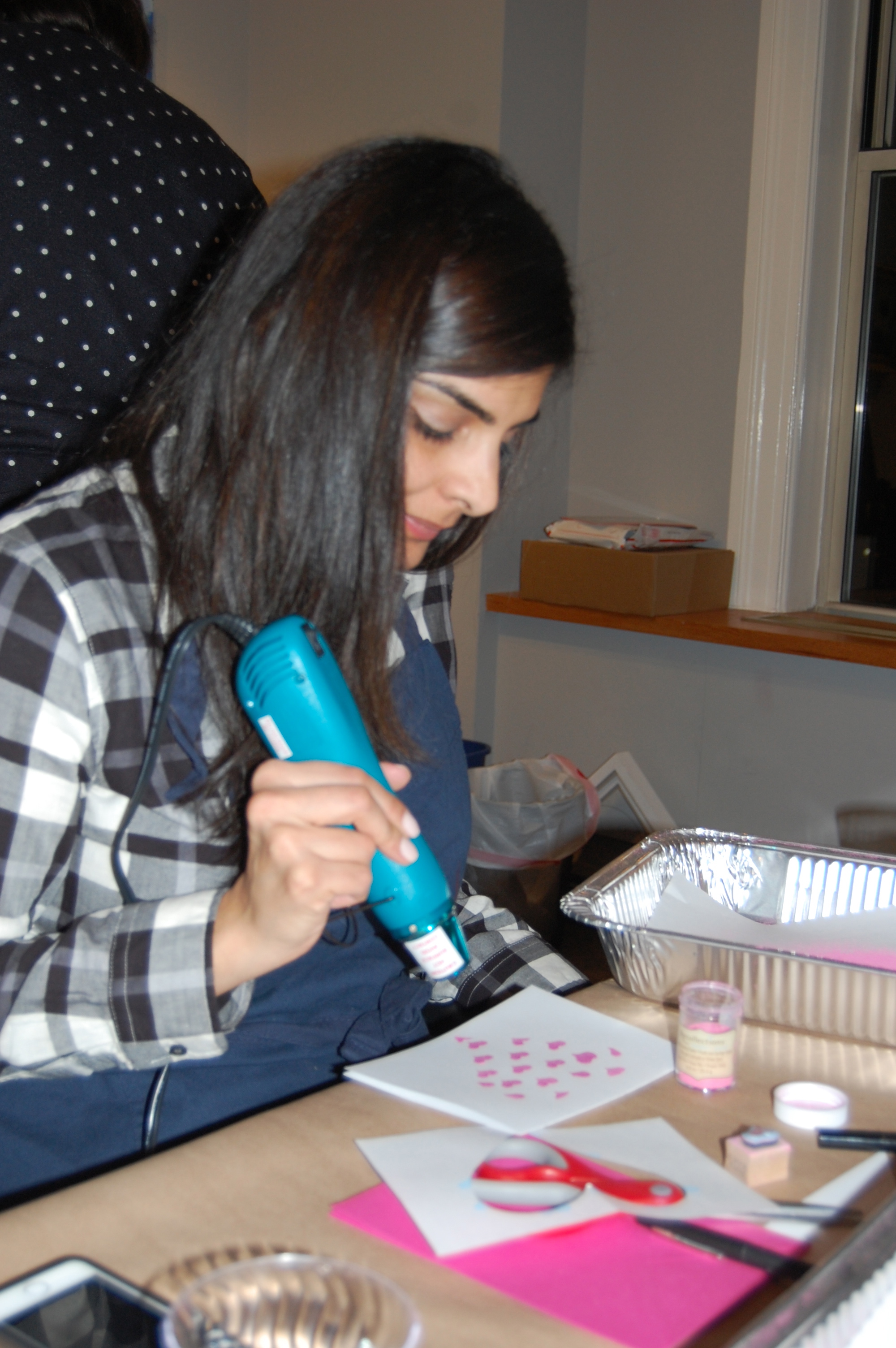 Over the aforementioned wine and cheese, she taught a perfectly sized group how to use ink and an embossing gun to make valentines. While I usually think of embossing as ink being pushed into cardstock, at this class we applied ink on top of paper (in cute heart shapes), sprinkled pink embossing powder to that ink, which when heated serves as glue, and used the embossing gun to heat the powder to melt into onto the paper.