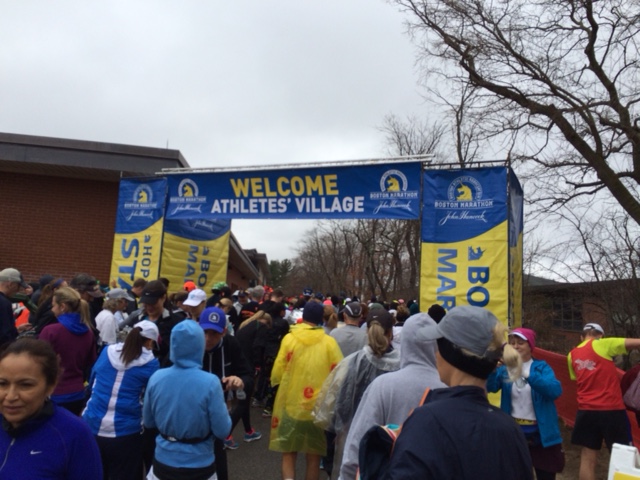 After arriving at the Athlete’s Village and waiting in a 40 minute line for the bathroom, I finally saw a friendly face: a co-worker also running Boston for the first time. It was great to have someone to walk and chat with, it cut the tension building in my mind and body. With 30,000 plus people running this race, I saw another familiar face when I reached corral #7 (actual proof that Boston is a really small town). As we started to trot towards the starting line, the excitement was palpable, and the rain started falling. Hard.