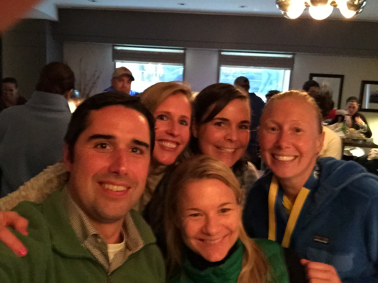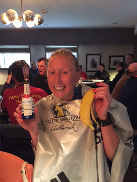 Crossing the finish line was euphoric, but also a reality check. As soon as my legs slowed to a walk they stiffened up and I started shaking from the cold. Thanks to the volunteers who helped me get into my tinfoil blanket and peeled my banana for me because my fingers were too cold to function. I limped to the bar where I would rendezvous with my Dad and friends. Within minutes I had warmed up, and I chased my marathon with a banana and bubbly (a great combination, in case you are wondering). Celebrating with my Dad and some of my best friends, a celebration that eventually devolved into a 90’s dance party, was the icing on my Boston Marathon cake.
